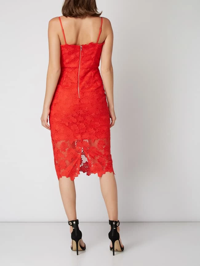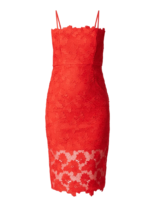 Das Kleid von Bardot ist aus floraler Spitze gefertigt. Es zeigt sich in eng anliegender Passform mit Karree-Ausschnitt und verstellbaren Spaghettiträgern.