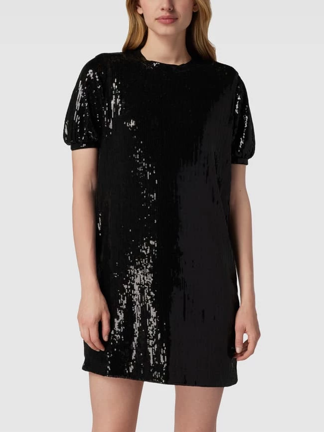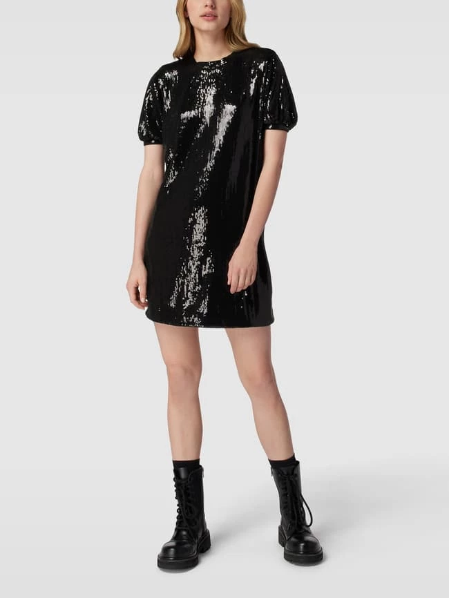Das Minikleid von BOSS ist aus einem Material-Mix mit Elasthan-Anteil gefertigt und gerade geschnitten. Es zeigt sich mit Paillettenbesatz und Rundhalsausschnitt.