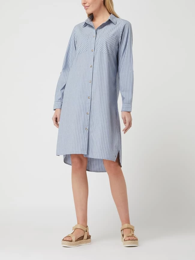 Das Hemdblusenkleid von BROADWAY ist aus einem Baumwoll-Viskose-Mix gefertigt. Es zeigt sich in ausgestellter Passform mit Streifenmuster, Umlegekragen und Knopfleiste.