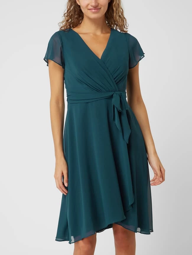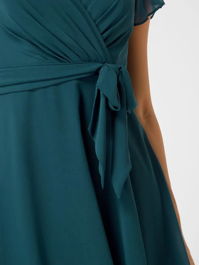 Das Cocktailkleid von Christian Berg Cocktail ist aus Chiffon gefertigt. Es zeigt sich in taillierter Passform mit V-Ausschnitt in Wickel-Optik, kurzen Volantärmeln und Taillengürtel zum Binden.