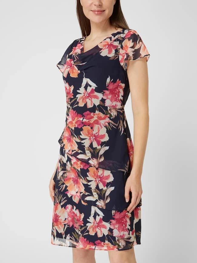 Das Cocktailkleid von Christian Berg Cocktail ist aus Chiffon gefertigt und eng anliegend geschnitten. Es zeigt sich im Stufen-Look mit floralem Muster, Wasserfall-Ausschnitt und kurzen Ärmeln.