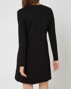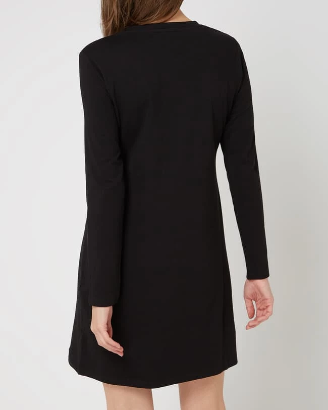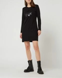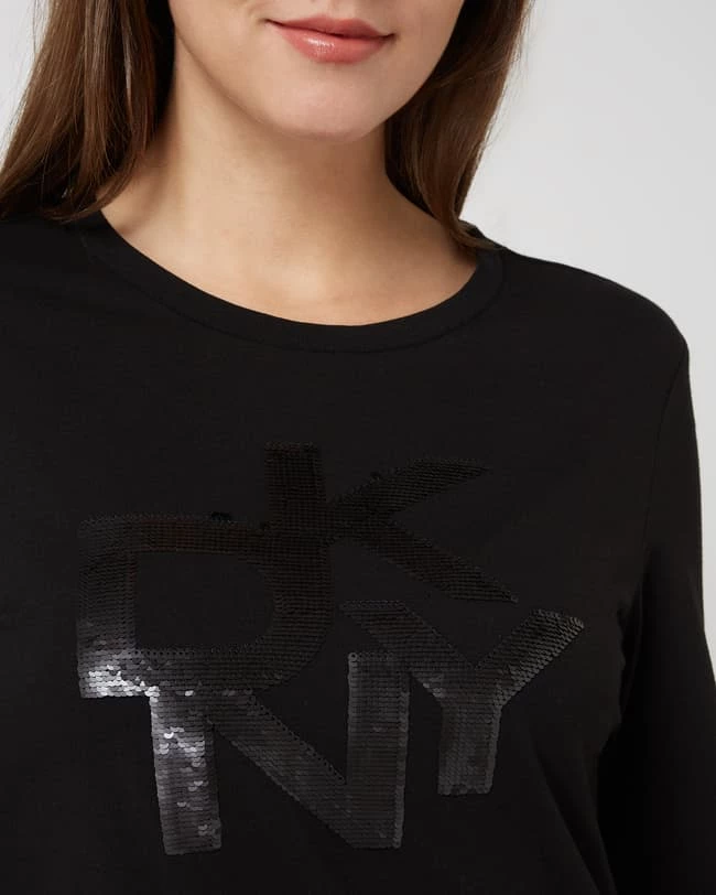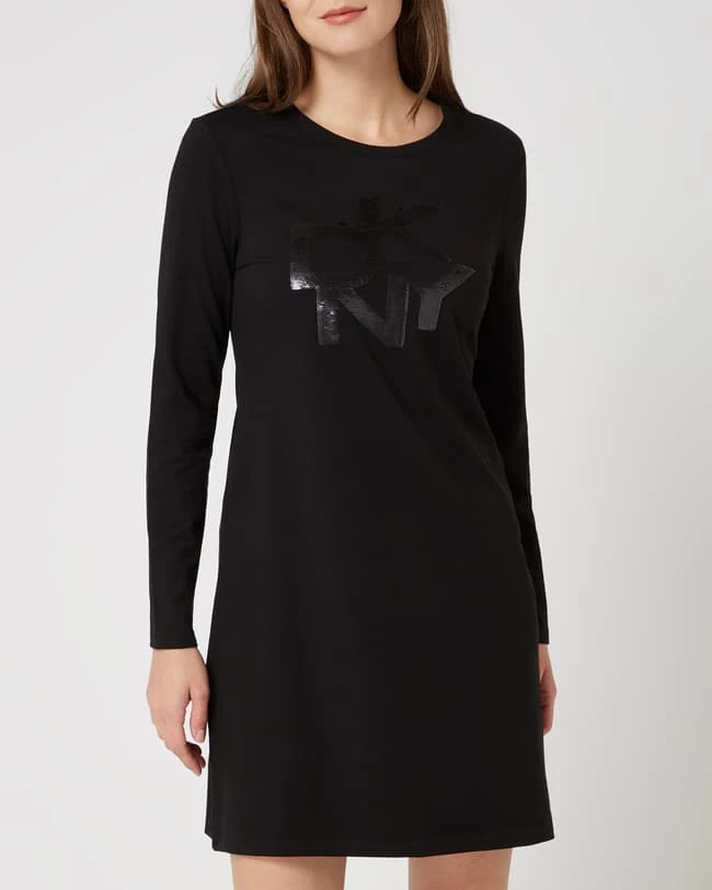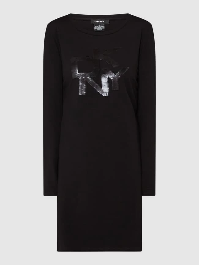 Das Shirtkleid von DKNY ist aus einem Baumwoll-Elasthan-Mix gefertigt und ausgestellt geschnitten. Es kommt mit Rundhalsausschnitt, langen Ärmeln und Logo aus Pailletten.