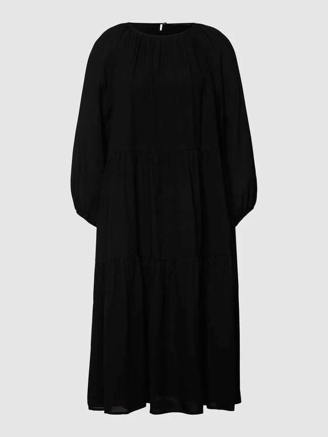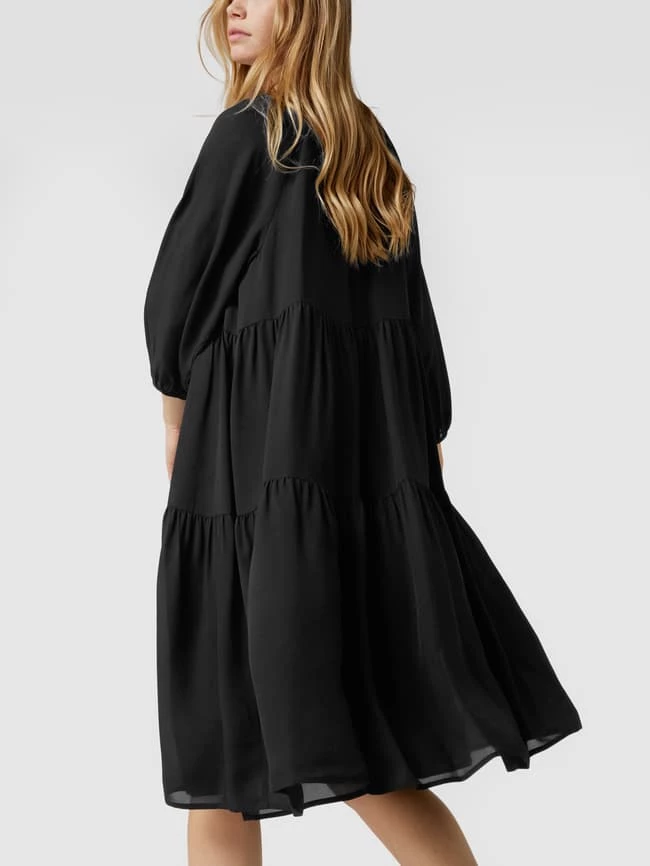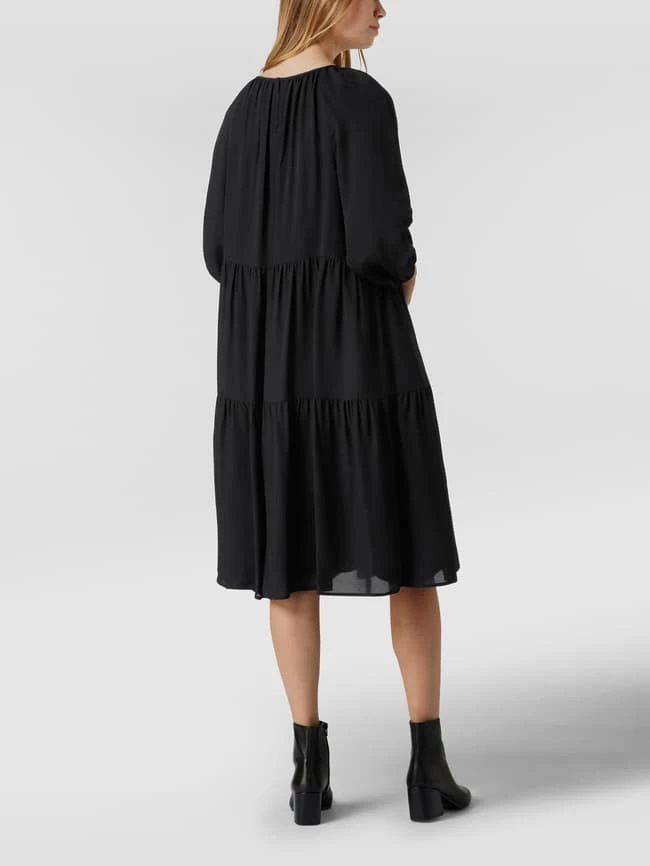 Das Midikleid von DRYKORN ist aus reiner Viskose gefertigt und locker geschnitten. Es kommt im Stufen-Look mit Rundhalsausschnitt, Raffungen und semitransparentem Obermaterial.