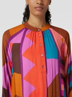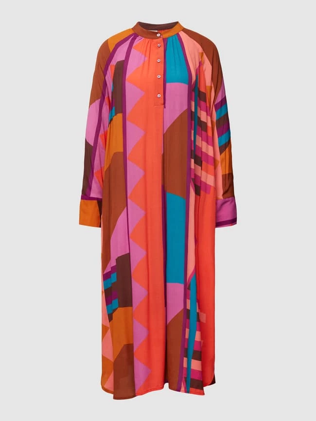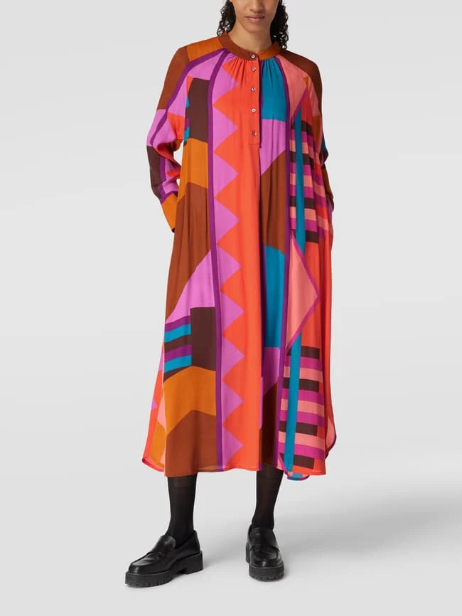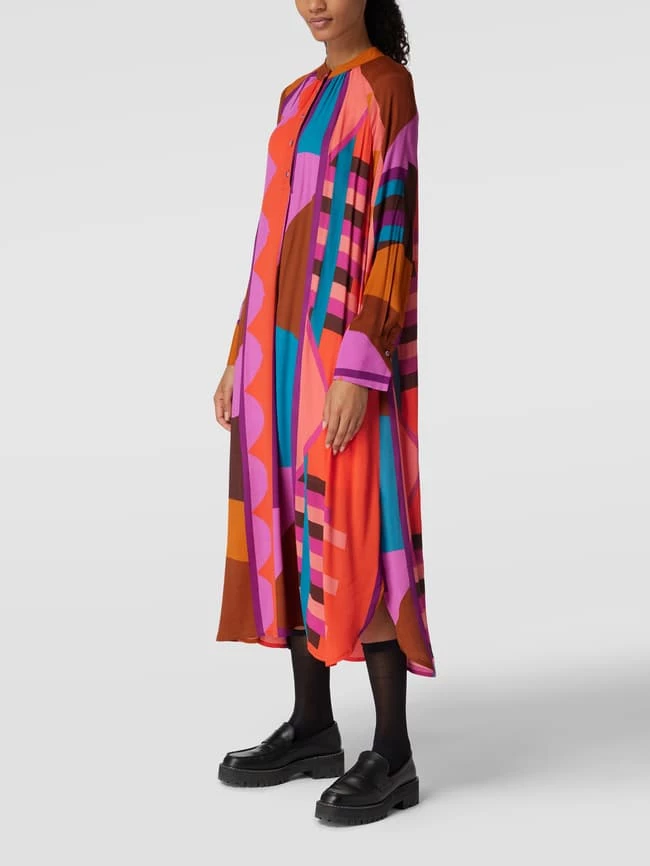 Das Midikleid von Emily Van den Bergh ist aus reiner Viskose gefertigt und locker geschnitten. Es zeigt sich mit Allover-Muster, Raglanärmeln und Maokragen.