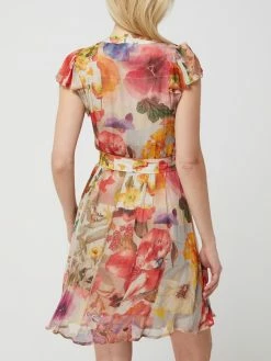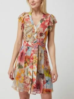 Das Blusenkleid von Frogbox ist aus reiner Viskose gefertigt und tailliert geschnitten. Es zeigt sich mit floralem Muster, Knopfleiste und Volantärmeln.