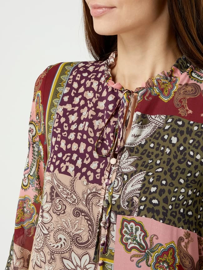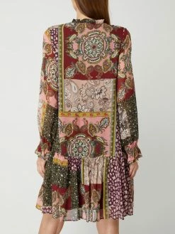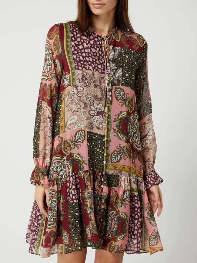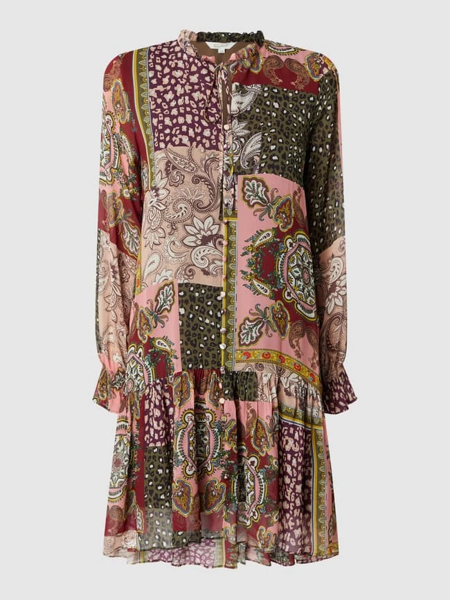 Das Kleid von Frogbox ist aus reiner Viskose gefertigt. Es zeigt sich mit Mustermix, gerüschtem Stehkragen und langen Trompetenärmeln.