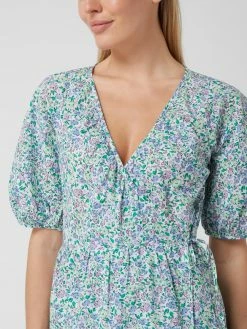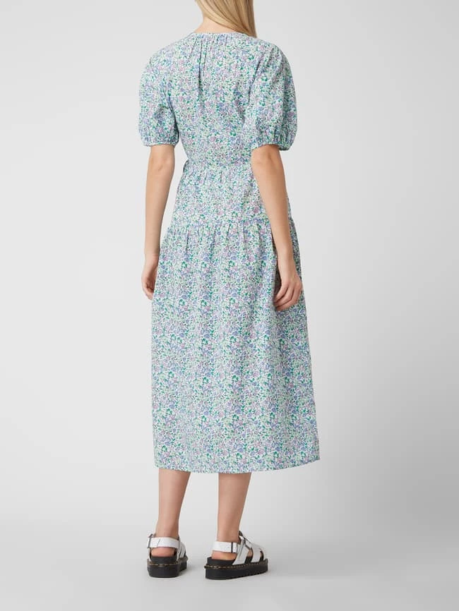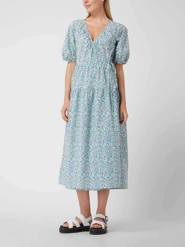 Das Wickelkleid von Great Plains ist aus reiner Baumwolle gefertigt und tailliert geschnitten. Es zeigt sich mit floralem Muster, Ballonärmeln und ausgestelltem Rockteil.