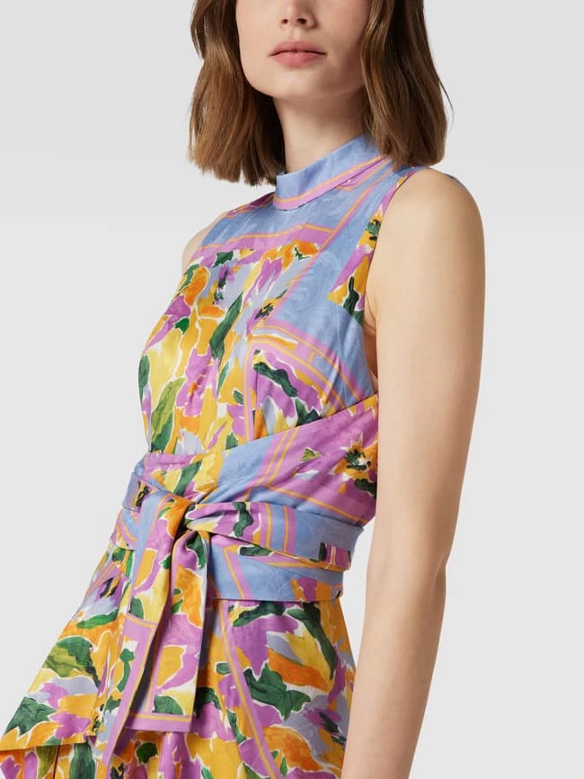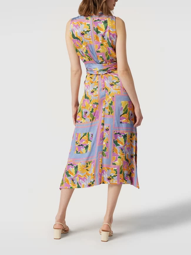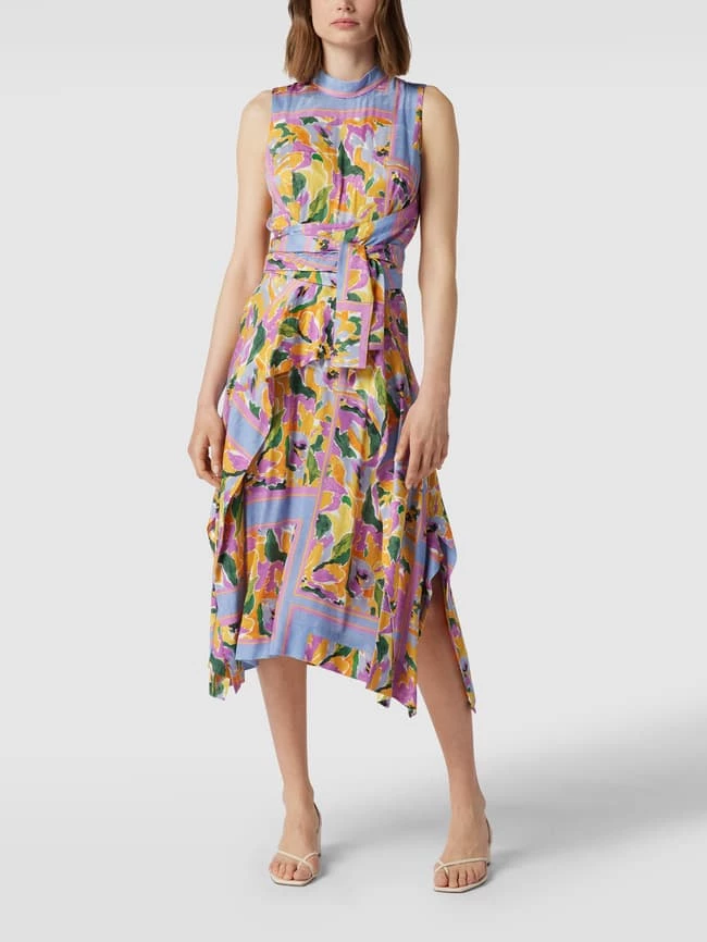 Das Midikleid von HUGO ist aus einem Cupro-Viskose-Mix gefertigt und tailliert geschnitten. Es kommt mit Allover-Muster, Stehkragen und Taillenband sowie asymmetrischem Saumverlauf.