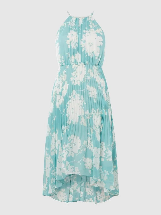 Das Cocktailkleid von Jake*s Cocktail ist aus Chiffon gefertigt und tailliert geschnitten. Es zeigt sich mit floralem Muster, Plisseefalten und Collierkragen.