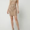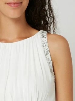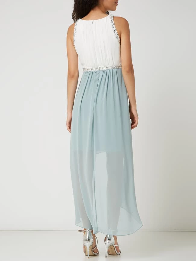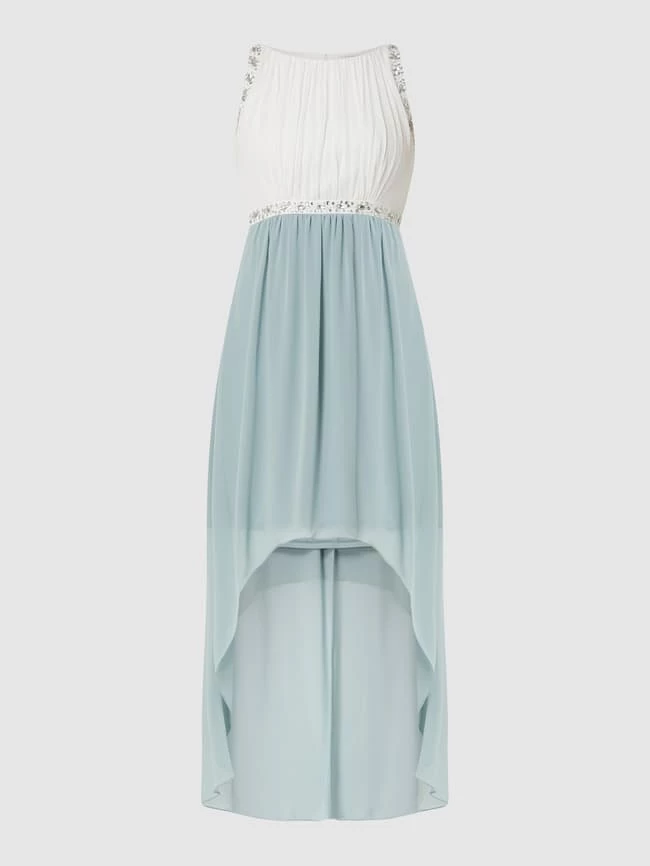 Das Cocktailkleid von Jake*s Cocktail ist aus Chiffon gefertigt und tailliert geschnitten. Es zeigt sich im Vokuhila-Look mit Raffungen und seitlichen Ziersteinen.