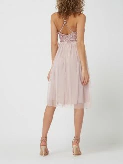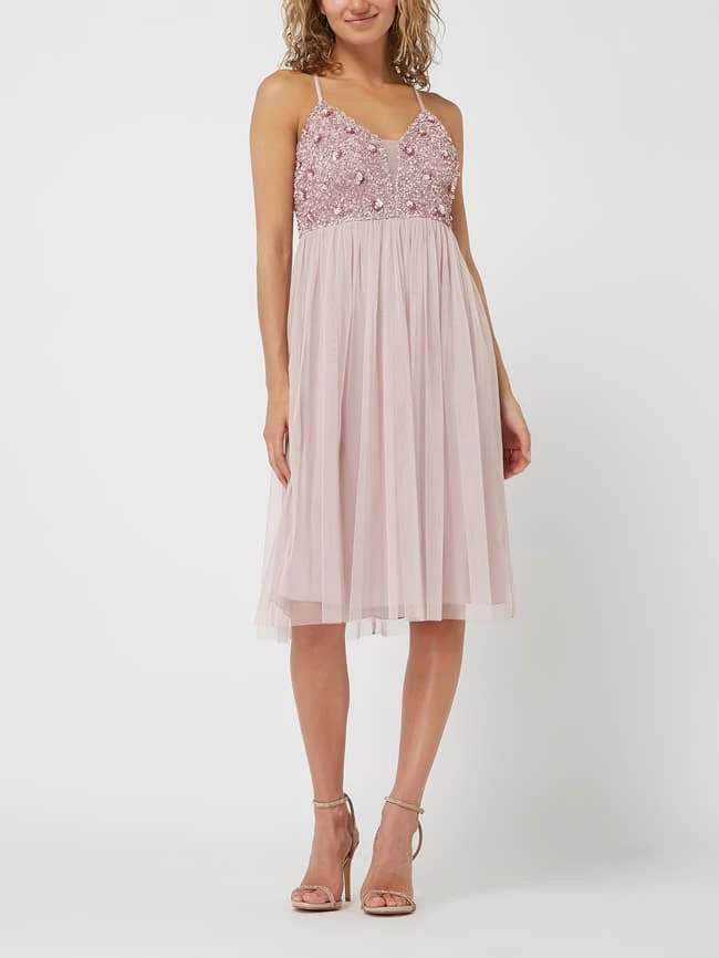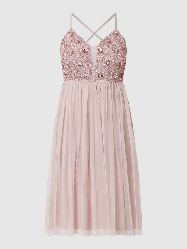 Das Cocktailkleid von Jake*s Cocktail ist aus Tüll gefertigt und tailliert geschnitten. Es zeigt sich mit Spaghettiträgern, Pailletten und tiefem Rückenausschnitt.