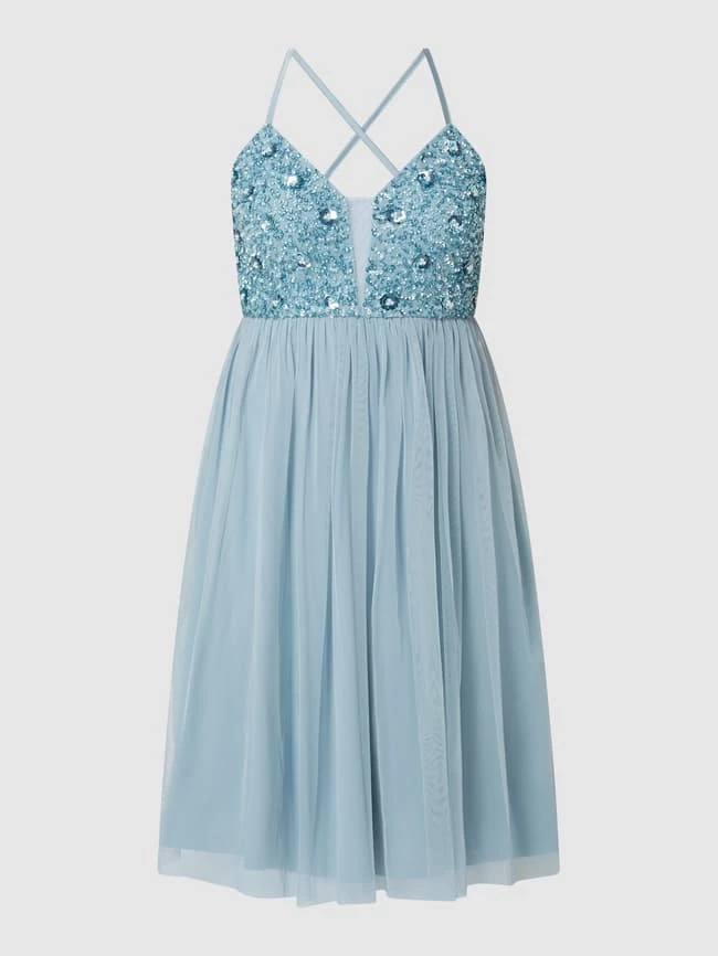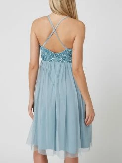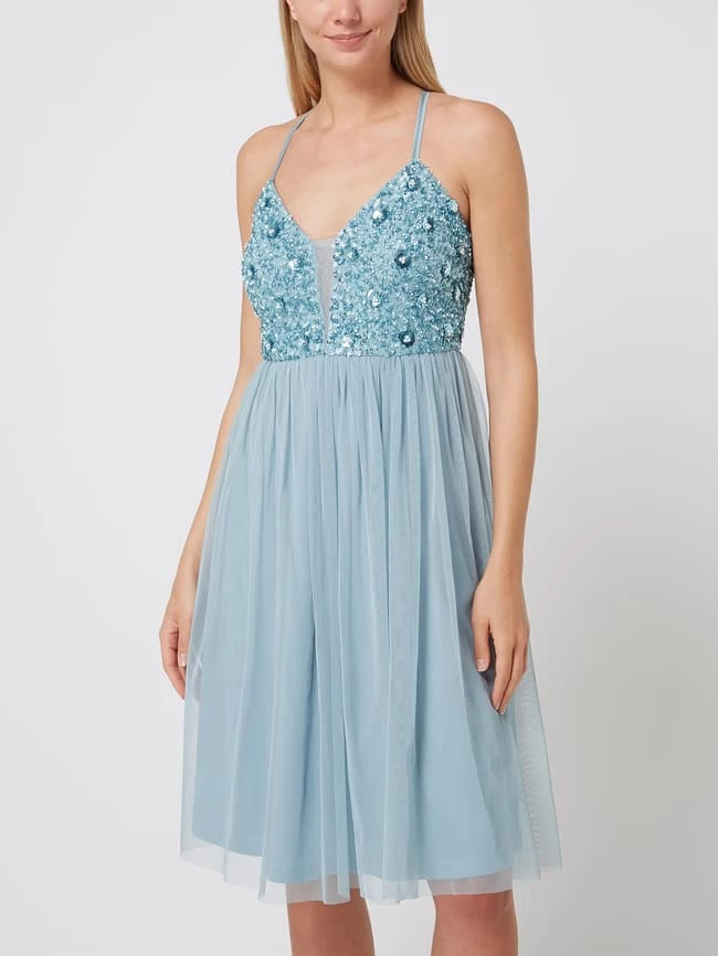 Das Cocktailkleid von Jake*s Cocktail ist aus Tüll gefertigt und tailliert geschnitten. Es zeigt sich mit Spaghettiträgern, Pailletten und tiefem Rückenausschnitt.