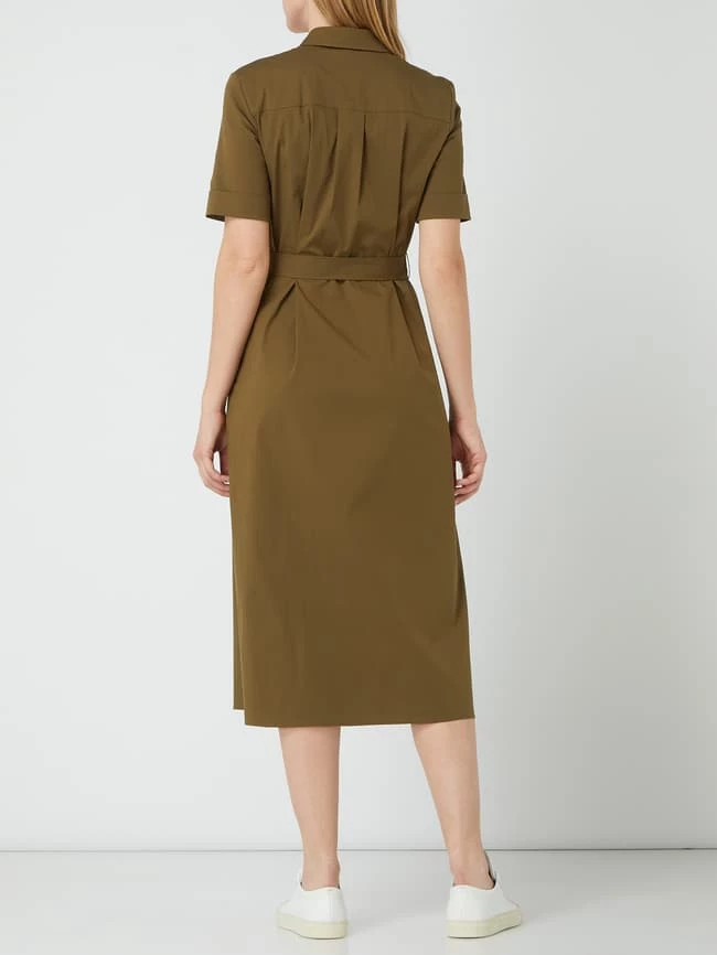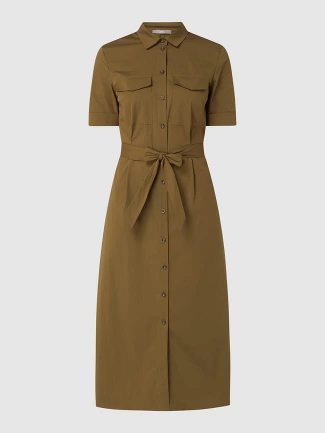Das Blusenkleid von Jake*s Collection ist aus einer leichten Baumwollmischung mit Stretch-Anteil gefertigt und tailliert geschnitten. Es zeigt sich im Utility-Look mit kurzen Ärmeln, Pattentaschen und Taillengürtel.
