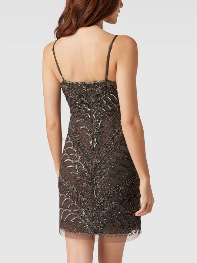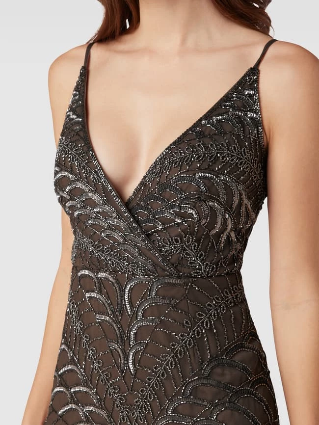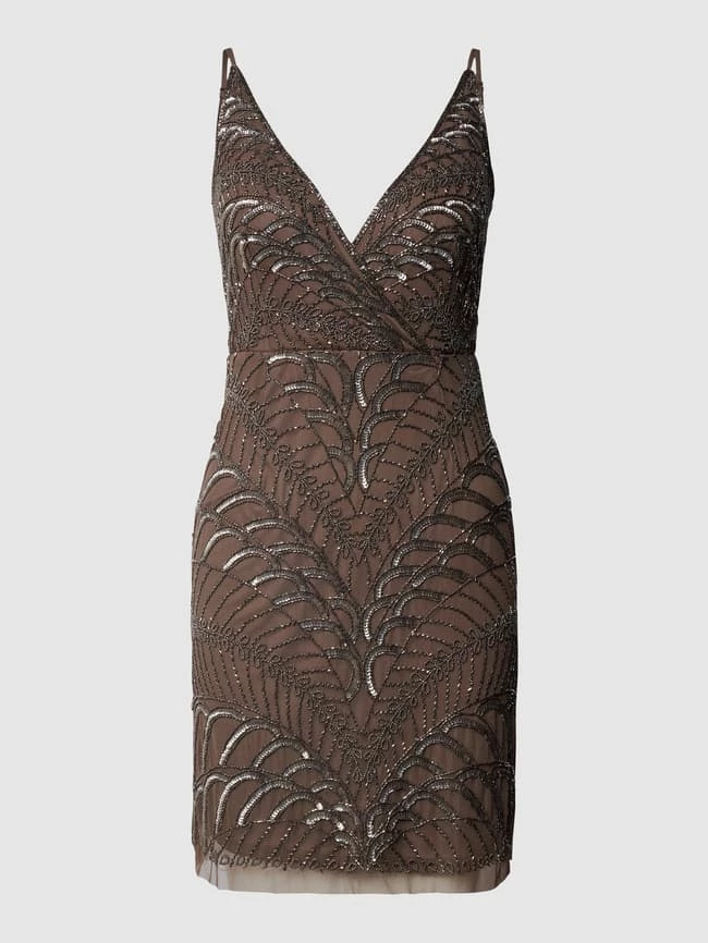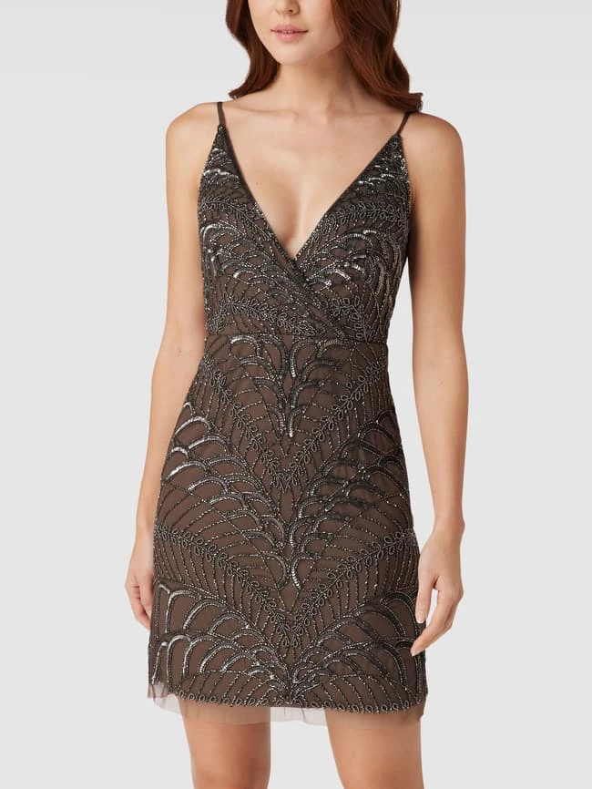 Das Cocktailkleid von Lace & Beads ist aus strapazierfähigem Material gefertigt und körpernah geschnitten. Es zeigt sich mit V-Ausschnitt in Wickel-Optik, verstellbaren Spaghettiträgern sowie Besatz aus Pailletten und Ziersteinen.