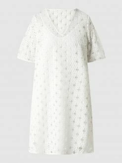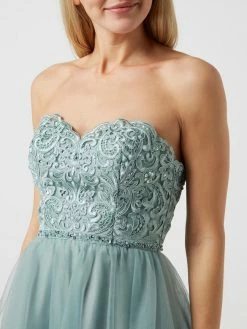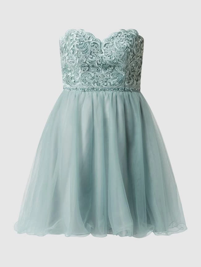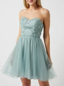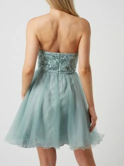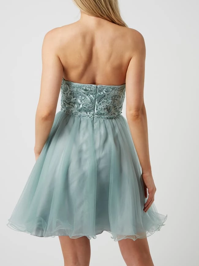 Das Cocktailkleid von LAONA ist aus Mesh gefertigt und tailliert geschnitten. Es kommt im Off-Shoulder-Look mit floralen Stickereien, Ziersteinen und mehrlagigem Rockteil.