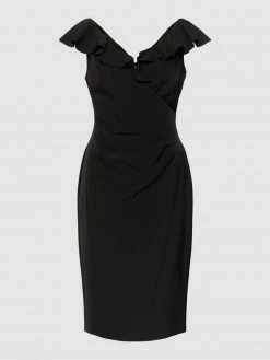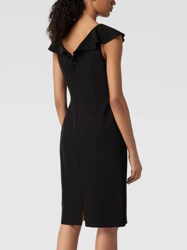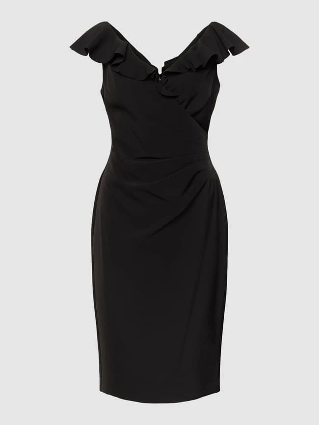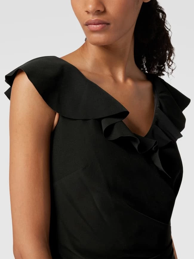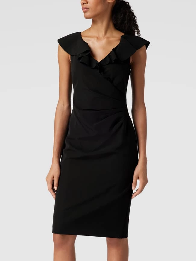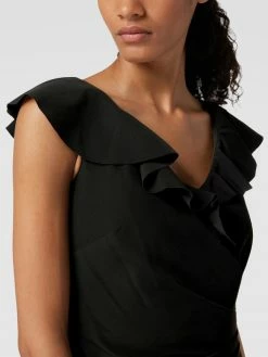 Das Cocktailkleid von Lauren Ralph Lauren ist aus einem Material-Mix mit Elasthan-Anteil gefertigt und körpernah geschnitten. Es zeigt sich in Wickel-Optik mit Volants.