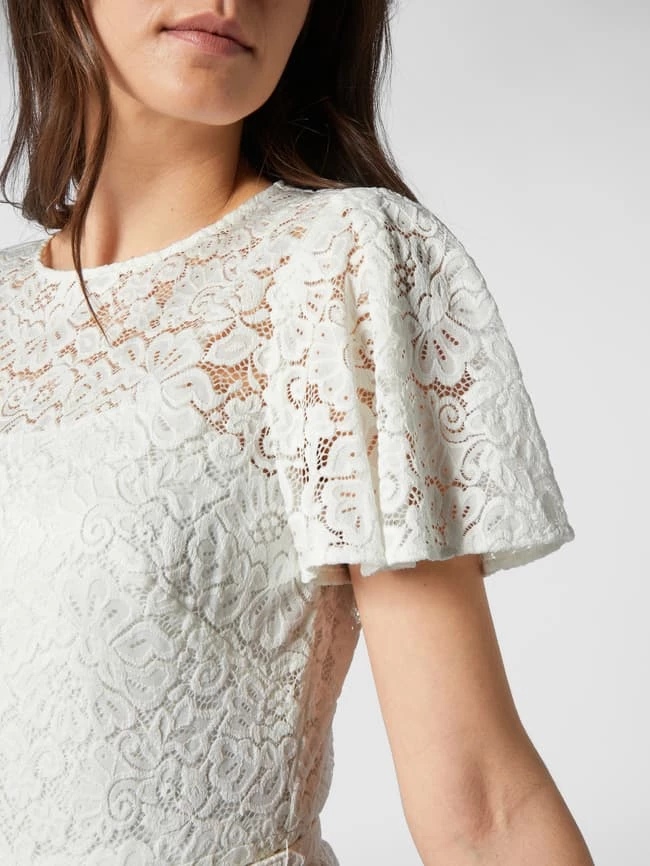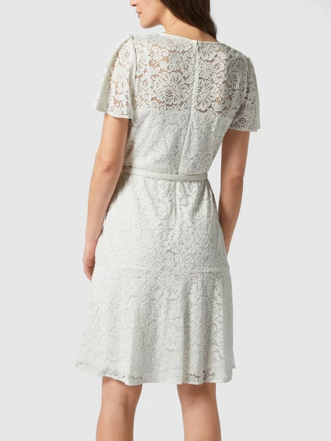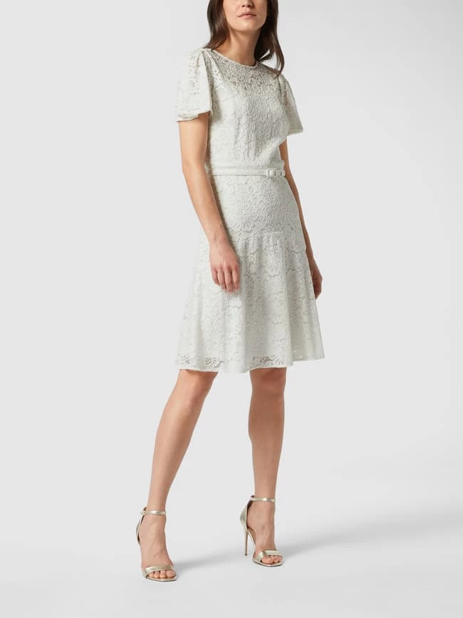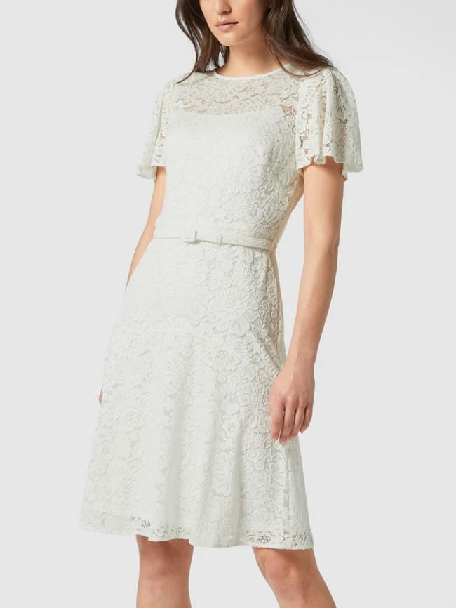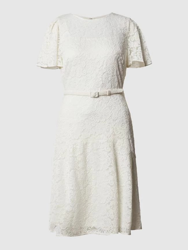 Das Kleid von Lauren Ralph Lauren ist aus strapazierfähigem Material gefertigt und tailliert geschnitten. Es kommt mit Rundhalsausschnitt, floralen Stickereien und Taillengürtel sowie kurzen Flügelärmeln.
