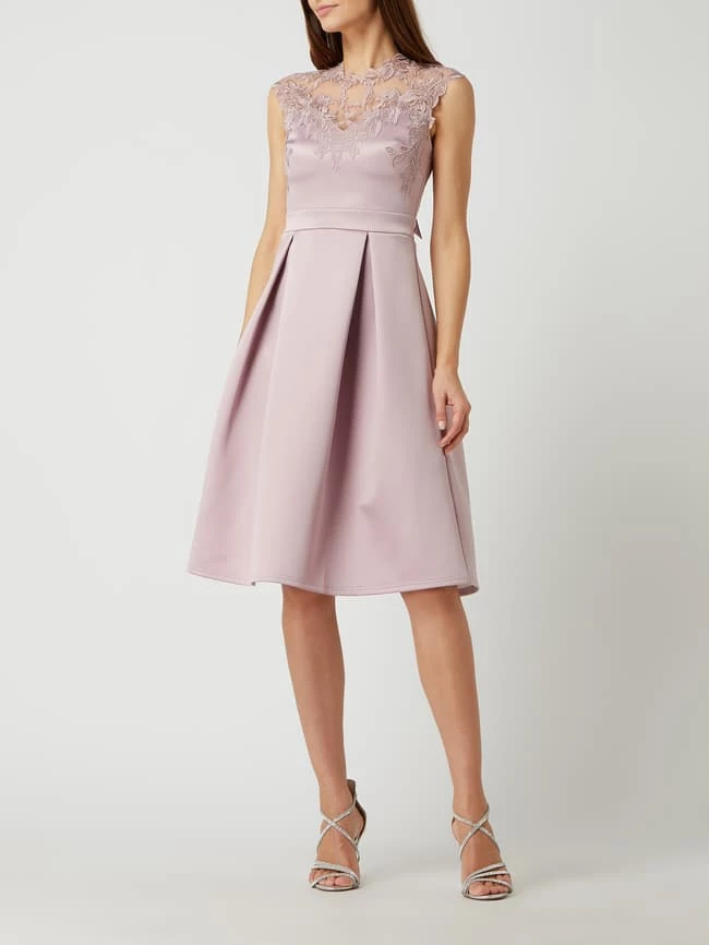 Das Cocktailkleid von Lipsy ist aus einer Materialmischung mit Stretch-Anteil gefertigt und tailliert geschnitten. Es kommt mit Kontrasteinsatz, floralen Stickereien und ausgestelltem Rockteil.