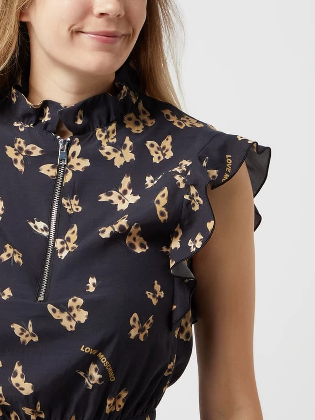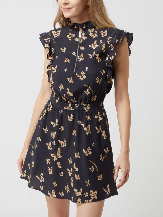 Das Minikleid von Love Moschino ist aus einem Cupro-Baumwoll-Mix gefertigt und tailliert geschnitten. Es zeigt sich mit Schmetterling-Prints, kurzen Volantärmeln und Reißverschluss.