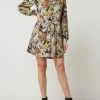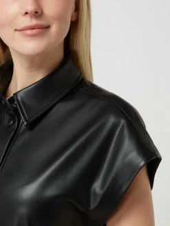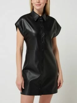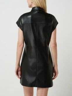 Das Kleid von MANGO zeigt sich in Leder-Optik. Es ist tailliert geschnitten und kommt mit Umlegekragen und Druckknopfleiste.