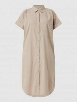 Das Kleid von MANGO zeigt sich in Leder-Optik. Es ist tailliert geschnitten und kommt mit Umlegekragen und Druckknopfleiste.