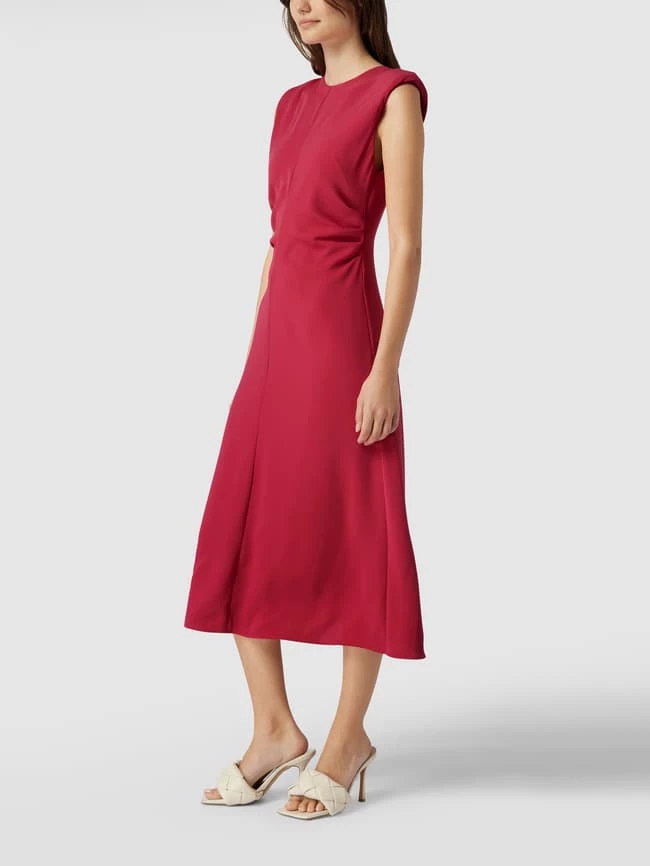 Das Midikleid von MANGO ist aus strapazierfähigem Material gefertigt und tailliert geschnitten. Es kommt im unifarbenen Design mit Rundhalsausschnitt, Raffungen und Schulterpolstern.