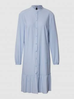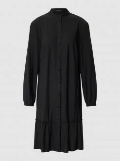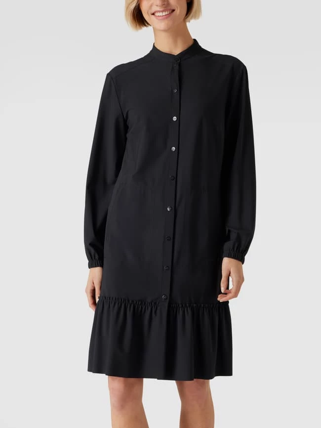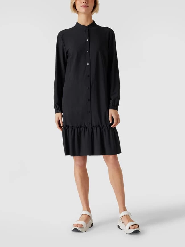 Das Blusenkleid von Marc Cain ist aus einem elastischen Material-Mix gefertigt und locker geschnitten. Es kommt in Knielänge mit Stehkragen, seitlichen Eingrifftaschen und Label-Print.