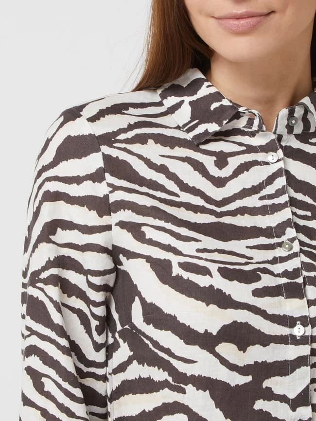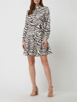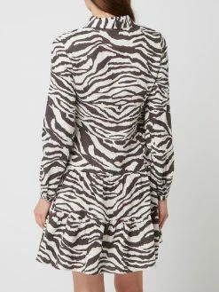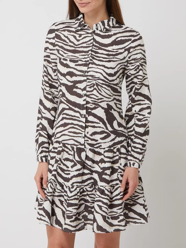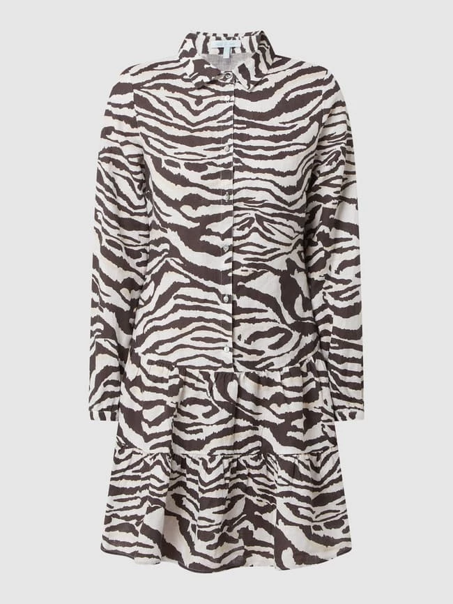 Das Kleid von mint & mia ist aus reinem Leinen gefertigt und tailliert geschnitten. Es kommt mit Animal-Print, Knopfleiste am Oberteil und Volantsaum