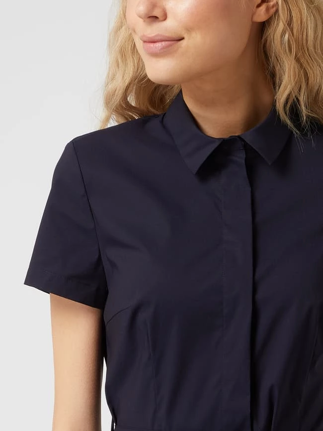 Das Blusenkleid von MONTEGO ist aus einer Baumwollmischung mit Stretch-Anteil gefertigt. Es zeigt sich in taillierter Passform mit verdeckter Knopfleiste, kurzen Ärmeln und Taillengürtel.