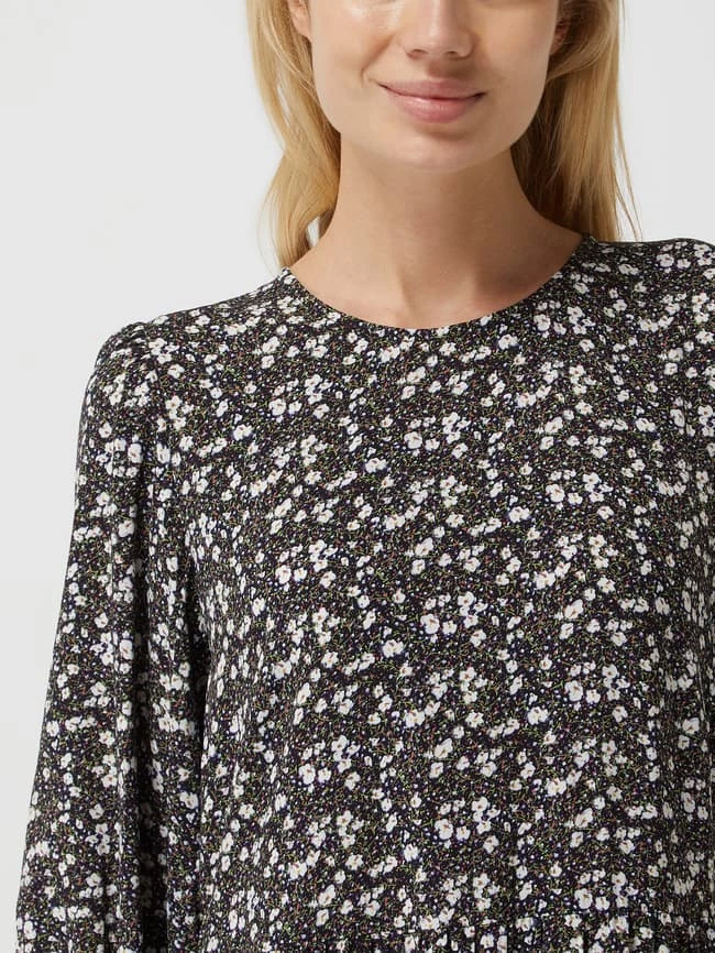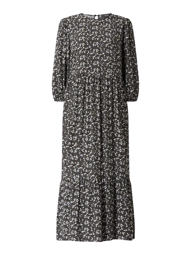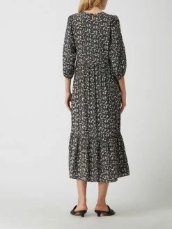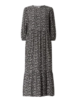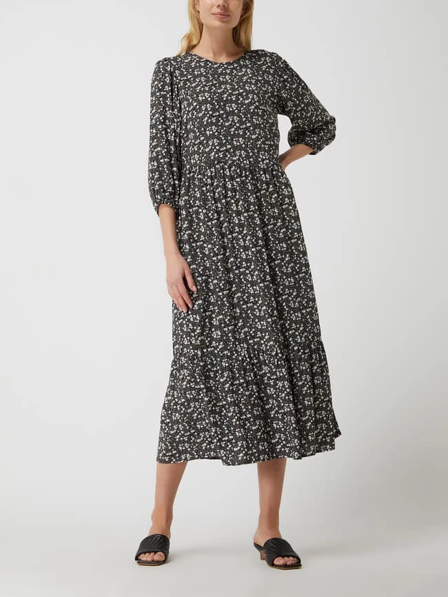 Das Kleid von MONTEGO ist aus reiner Viskose gefertigt und leicht ausgestellt geschnitten. Es zeigt sich mit floralem Muster, Rundhalsausschnitt und Volantsaum.