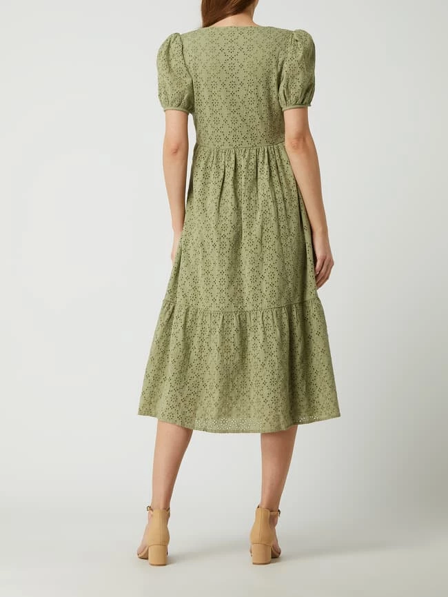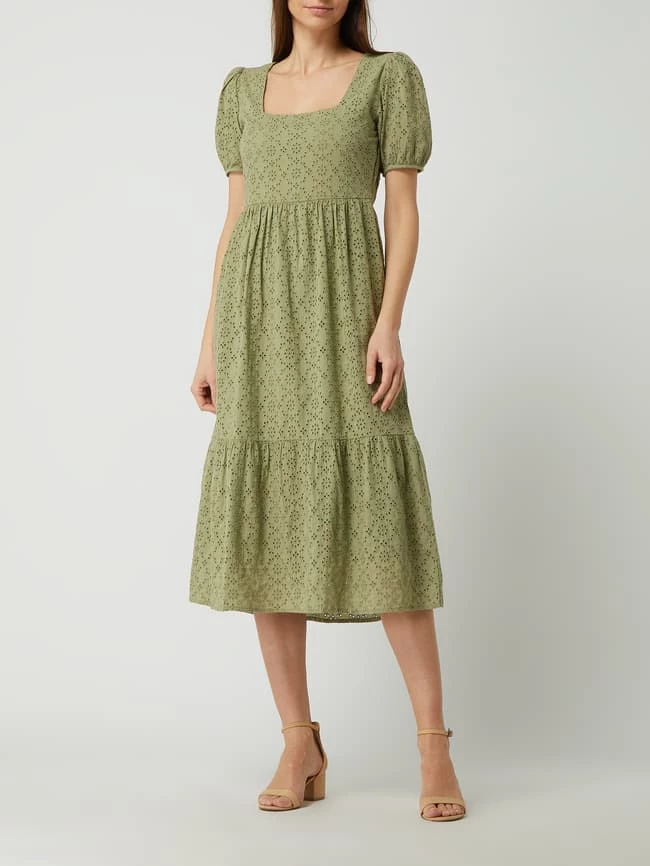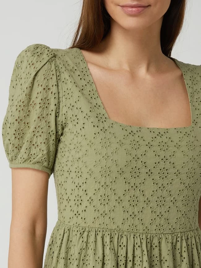 Das Kleid von Neo Noir ist aus reiner Baumwolle gefertigt und tailliert geschnitten. Es kommt mit Karree-Ausschnitt, kurzen Puffärmeln und Lochstickereien.