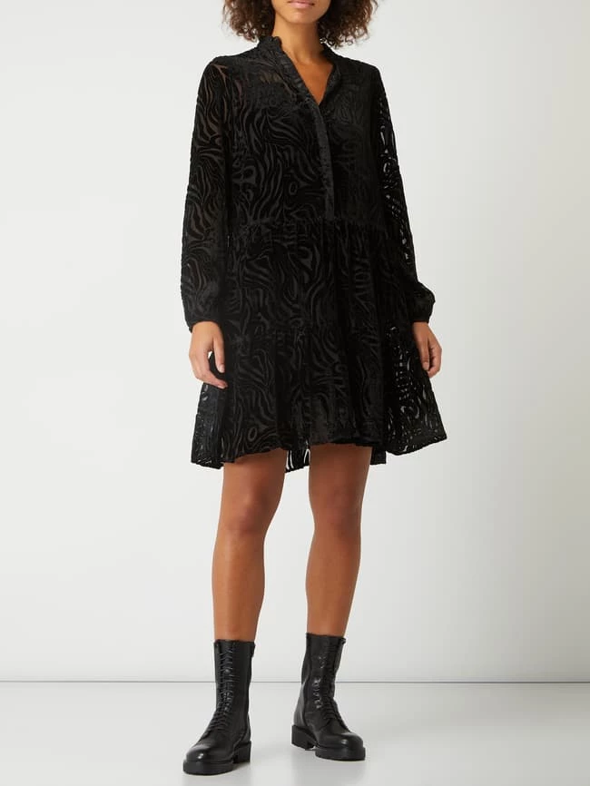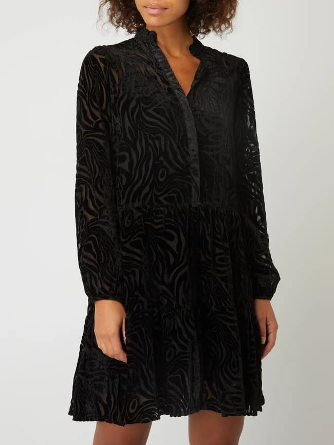 Das Kleid von Neo Noir x P&C* ist aus Samt gefertigt und ausgestellt geschnitten. Es zeigt sich mit Ausbrenner-Effekt, Tunikakragen und Rüschen. Das Modell ist exklusiv bei uns erhältlich.