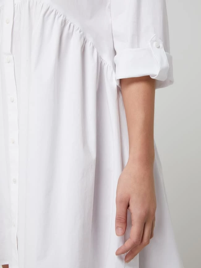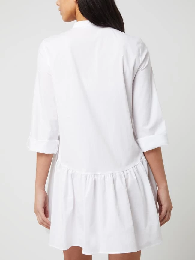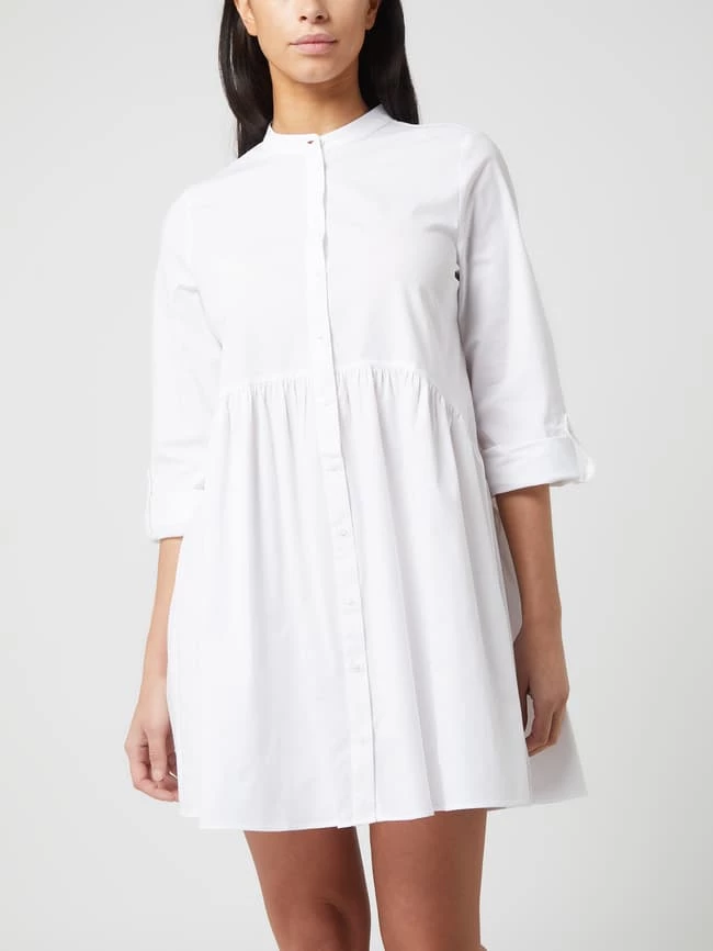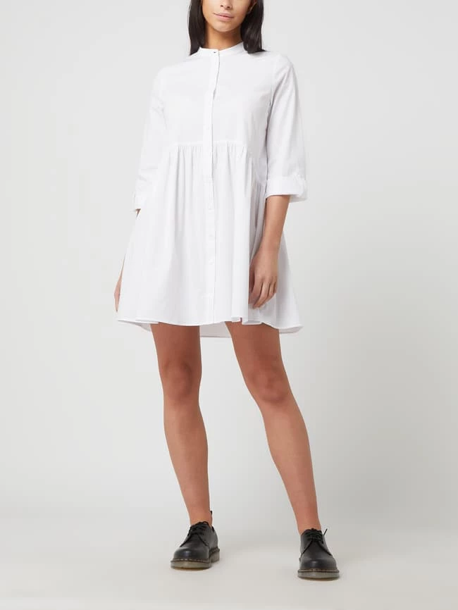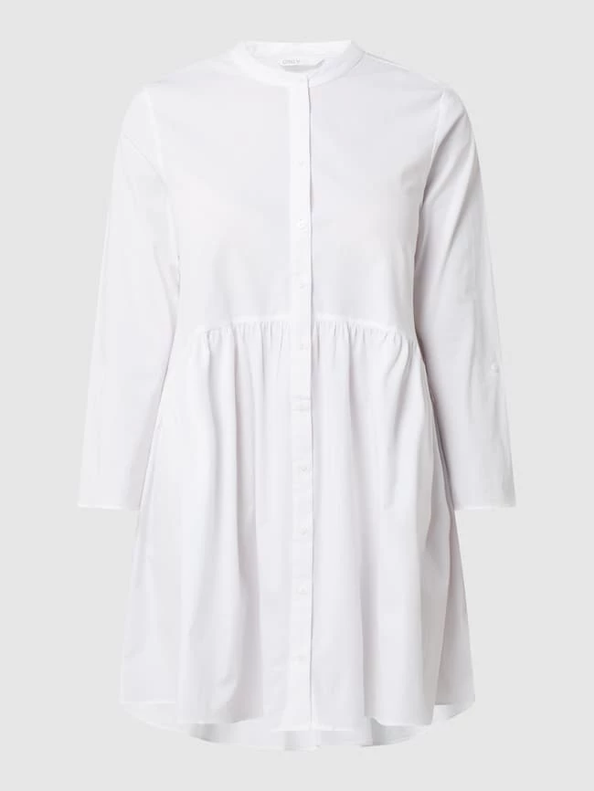 Das Blusenkleid von ONLY ist aus einem Baumwoll-Elasthan-Mix gefertigt und ausgestellt geschnitten. Es kommt mit schmalem Stehkragen, 7/8-Arm in regulierbarer Länge und Volantsaum.