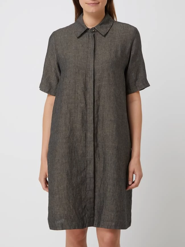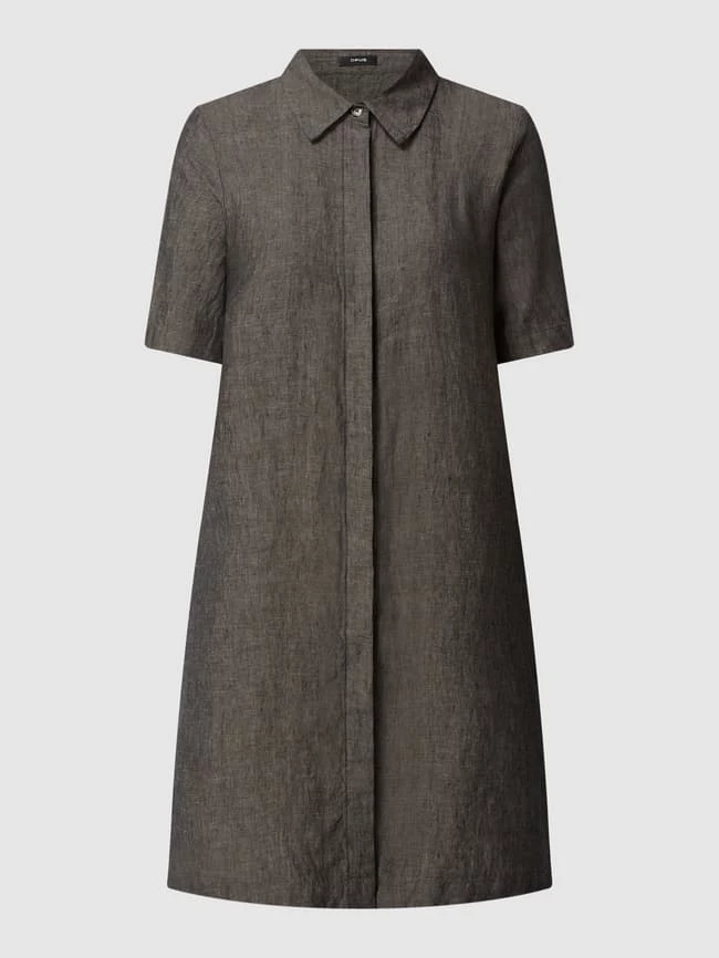 Das Blusenkleid von OPUS ist aus reinem Leinen gefertigt und ausgestellt geschnitten. Es zeigt sich mit Umlegekragen, Knopfleiste und Kellerfalte.