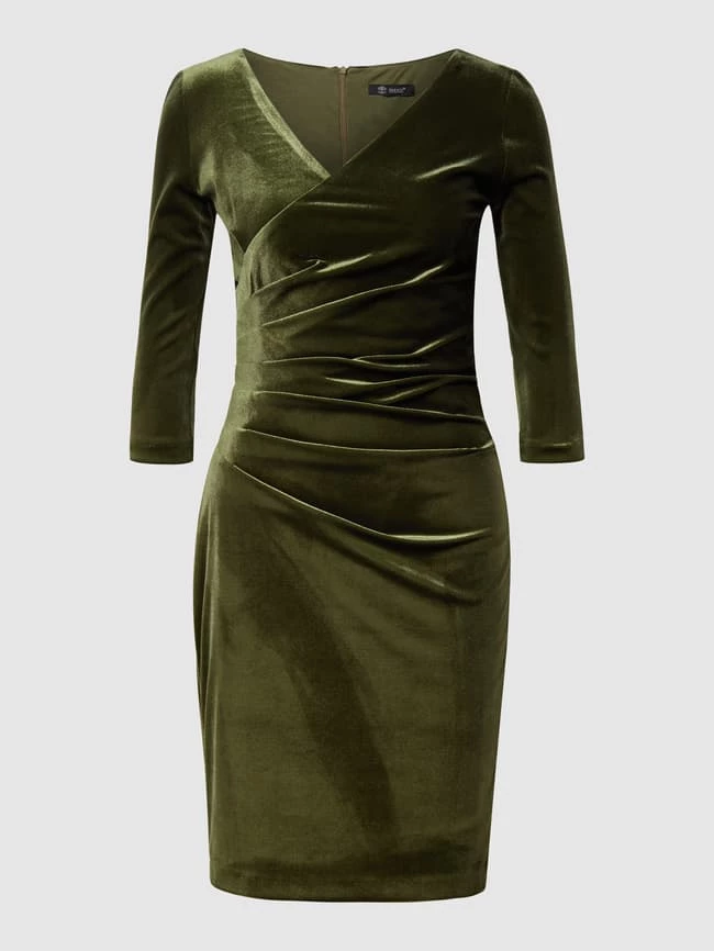 Das Cocktailkleid von Paradi ist aus einem elastischen Material-Mix gefertigt und eng anliegend geschnitten. Es kommt in Wickel- und Samt-Optik mit V-Ausschnitt und Drapierung.