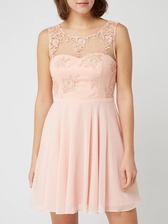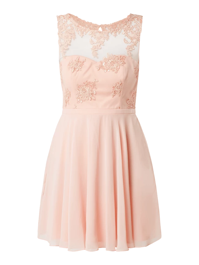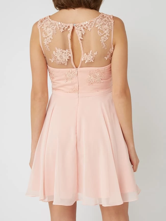 Das Cocktailkleid von Paradi ist aus Mesh und Chiffon gefertigt. Es zeigt sich in taillierter Passform mit Zierborten, Pailletten und ausgestelltem Rockteil.