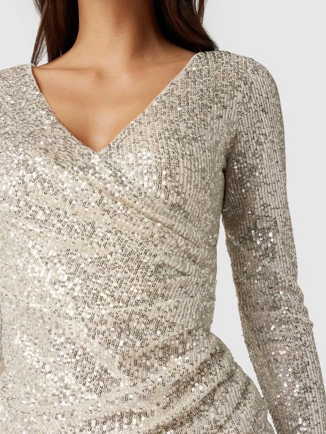 Das Cocktailkleid von Paradi ist aus einem elastischen Material-Mix gefertigt und eng anliegend geschnitten. Es kommt in Wickel-Optik mit Pailettenbesatz, V-Ausschnitt und semitransparentem Obermaterial.