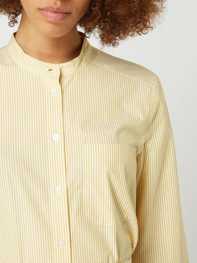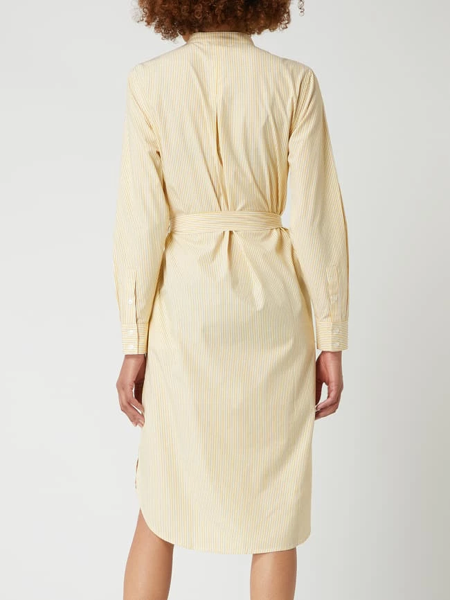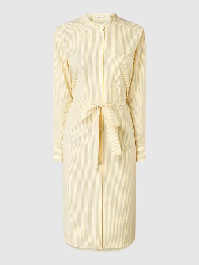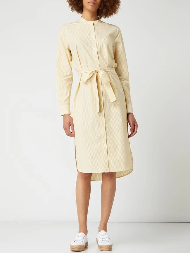 Das Hemdblusenkleid von Part Two ist aus reiner Baumwolle gefertigt und tailliert geschnitten. Es zeigt sich mit Streifenmuster, Stehkragen und Taillenband.