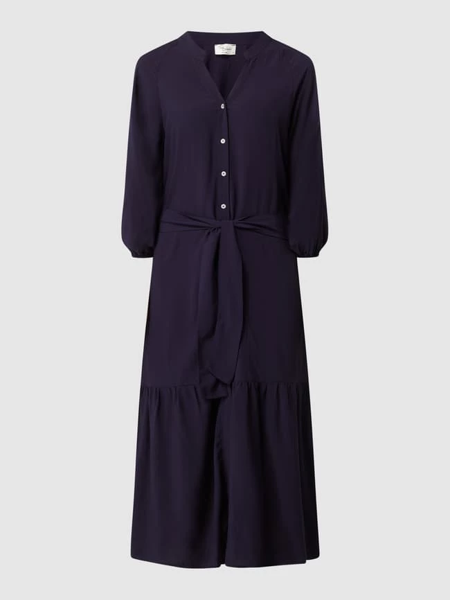 Das Midikleid von Pink Label ist aus reiner Viskose gefertigt. Es zeigt sich in taillierter Passform mit Tunikakragen, 3/4-Arm und Taillengürtel zum Binden.