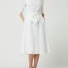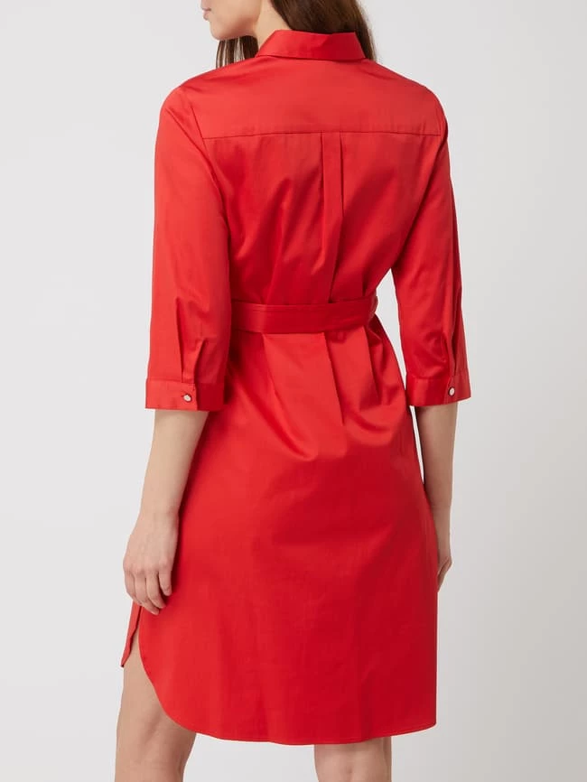 Das Blusenkleid von s.Oliver BLACK LABEL ist aus einem Baumwoll-Elasthan-Mix gefertigt und tailliert geschnitten. Es kommt mit Umlegekragen, verdeckter Knopfleiste und fixiertem Taillengürtel zum Binden.