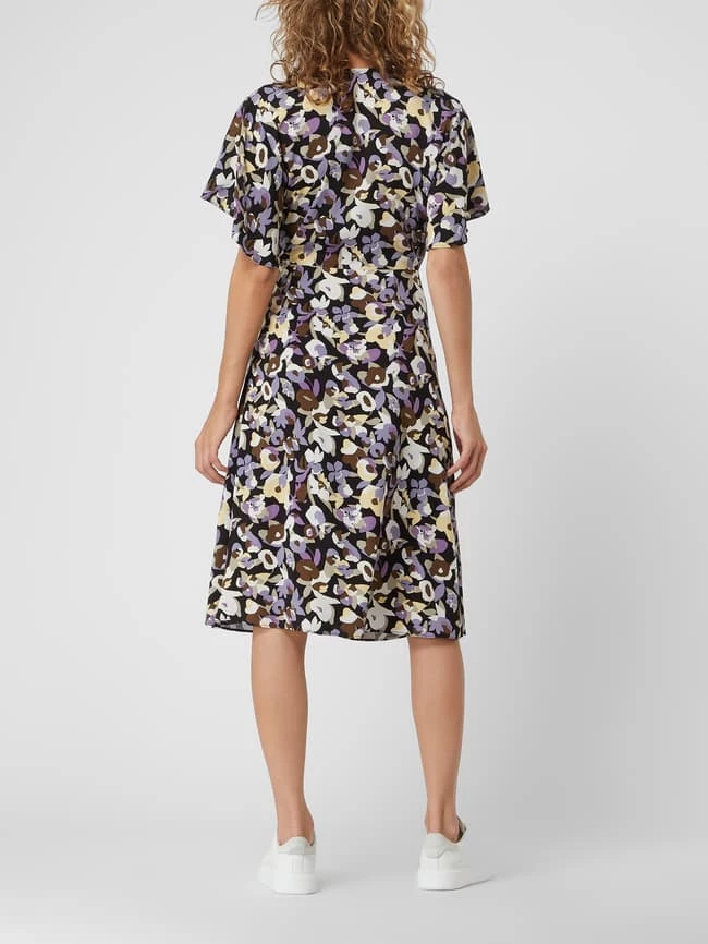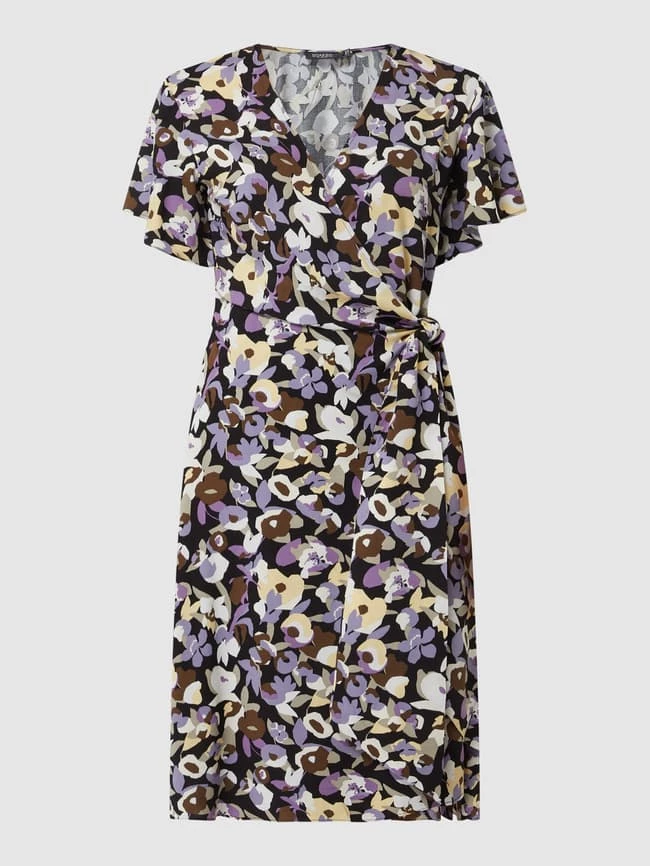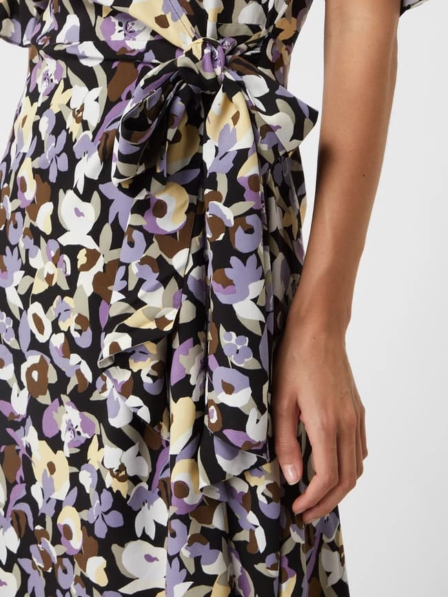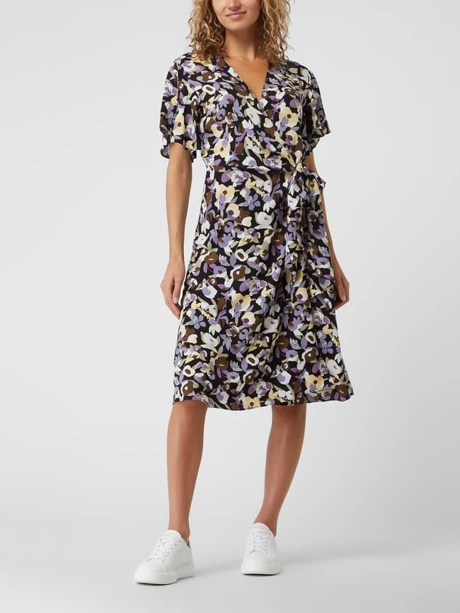 Das Wickelkleid von Soaked in Luxury ist aus reiner Viskose gefertigt und tailliert geschnitten. Es zeigt sich mit floralem Muster, Volantärmeln und seitlicher Schleife.