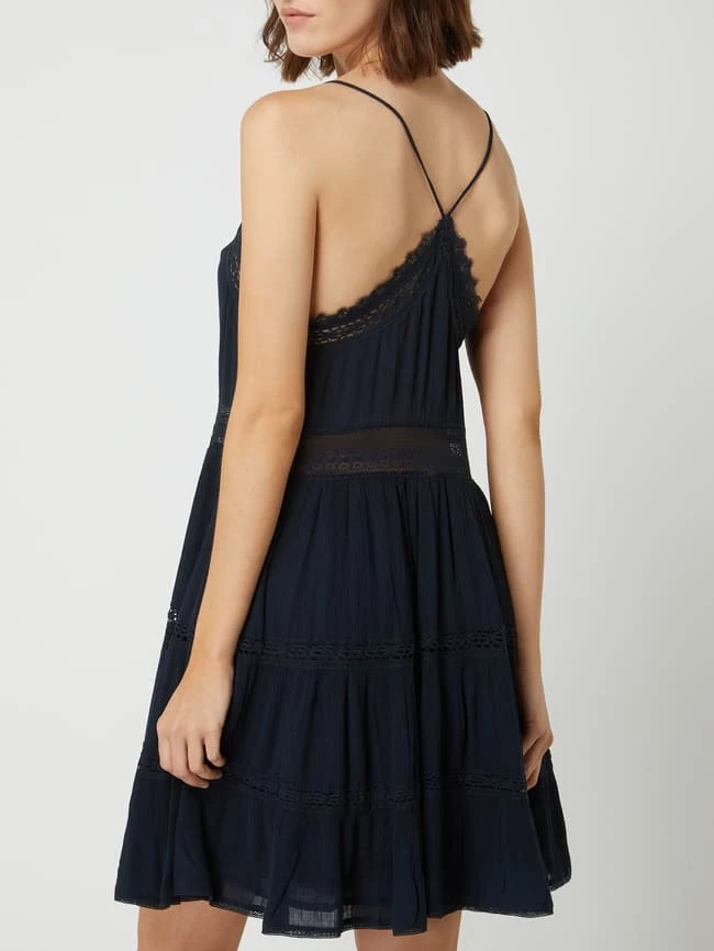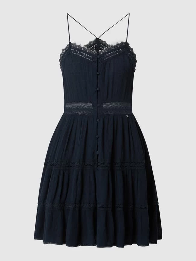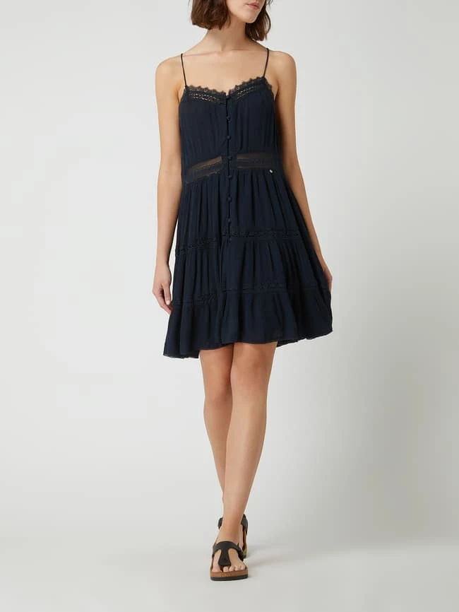 Das Kleid von Superdry ist aus einem Viskose-Modal-Mix gefertigt und tailliert geschnitten. Es zeigt sich mit Herz-Ausschnitt, Knopfleiste und Spitze.