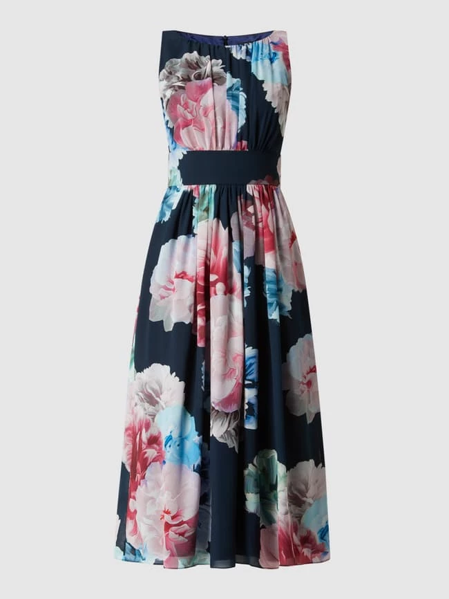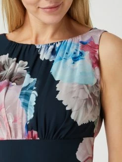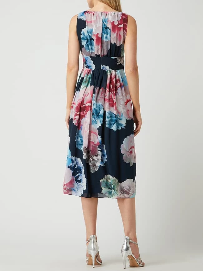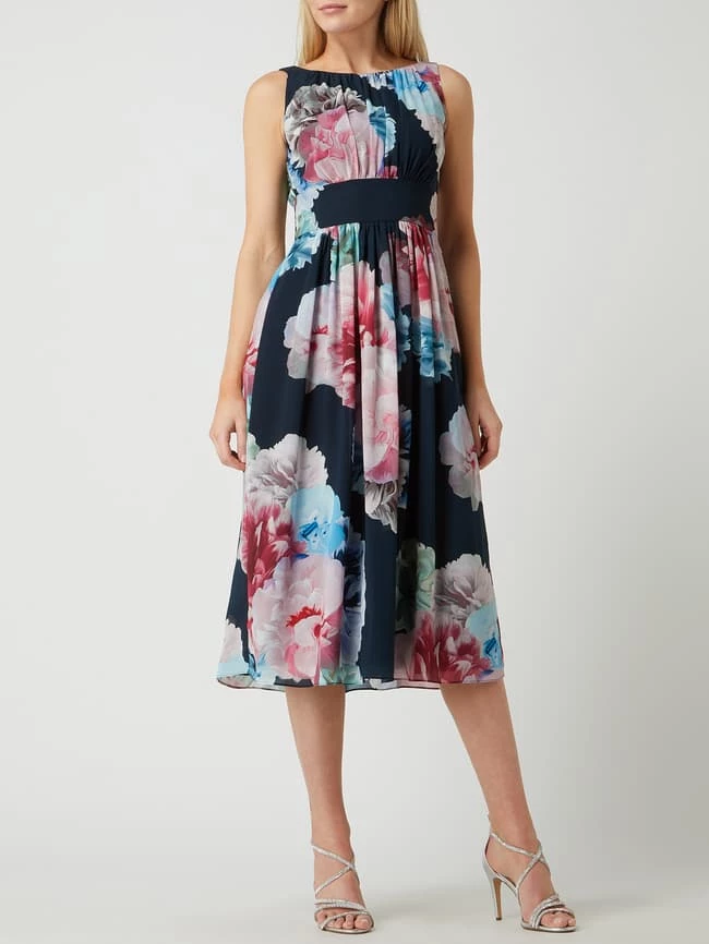 Das Cocktailkleid von SWING ist aus Chiffon gefertigt und tailliert geschnitten. Es zeigt sich mit floralem Muster, Raffungen und breiter Taillenpasse.