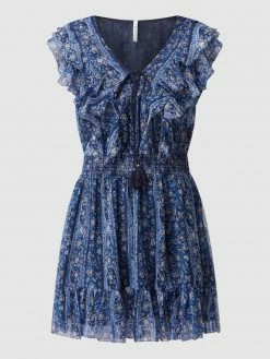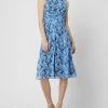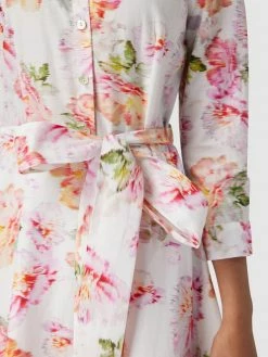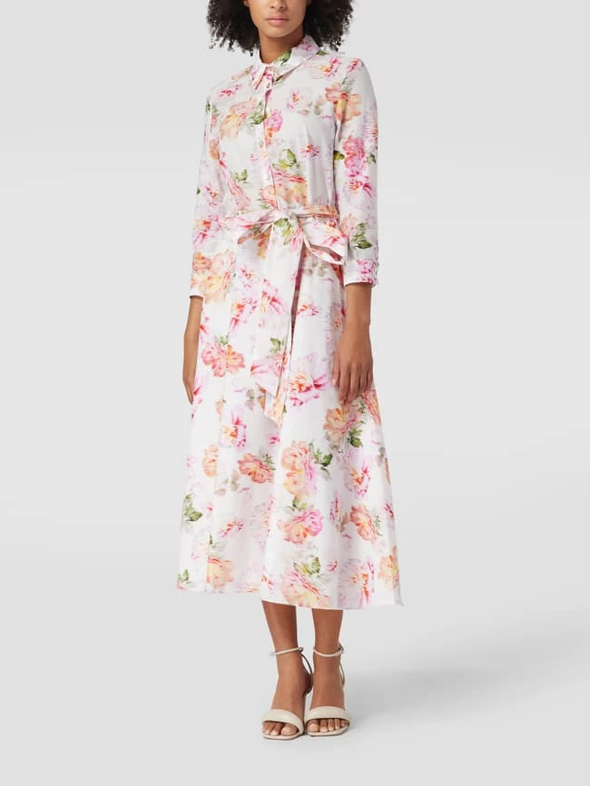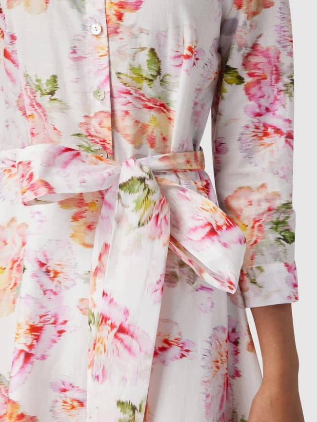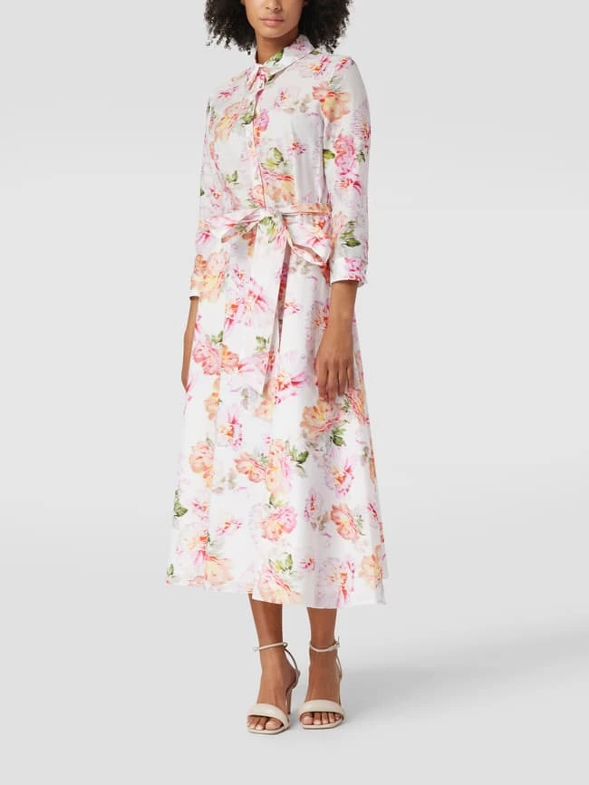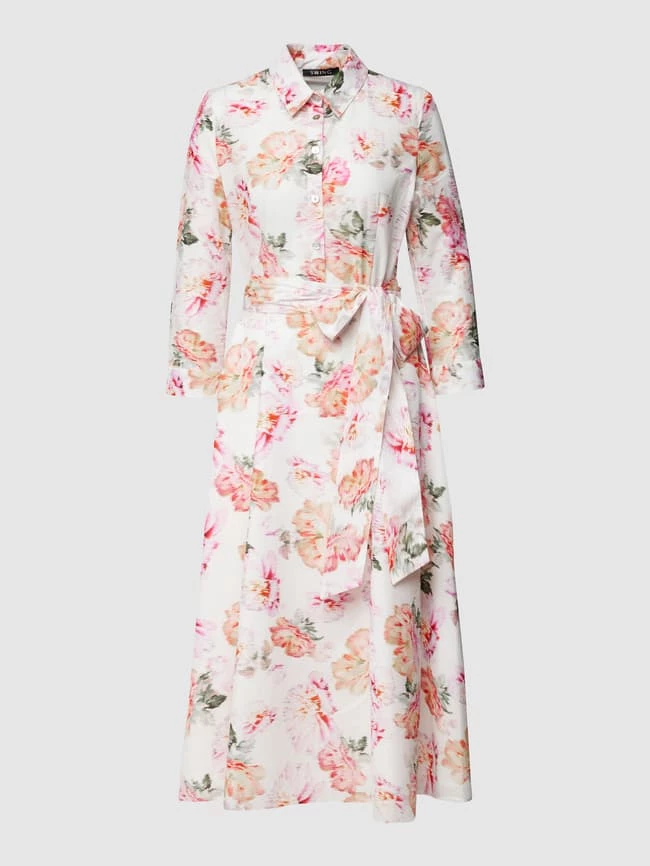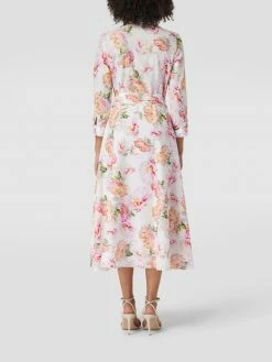 Das Cocktailkleid von SWING ist aus reiner Baumwolle gefertigt und kommt in A-Linie. Es zeigt sich im semitransparenten Look mit Umlegekragen und floralem Allover-Muster.