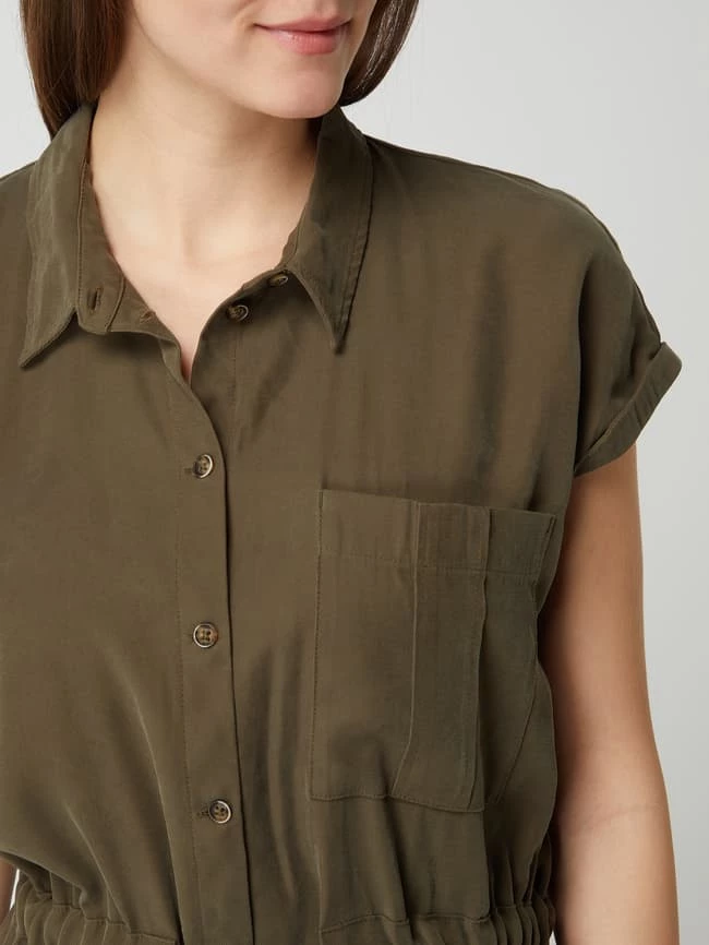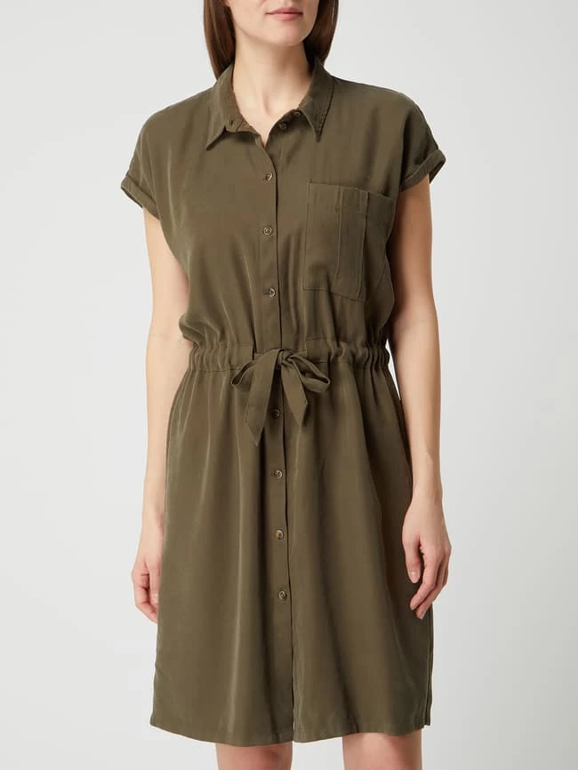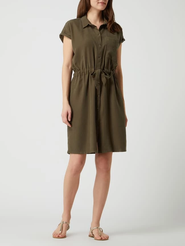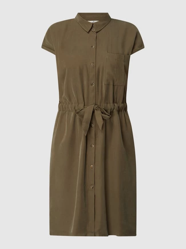 Das Kleid von TOM TAILOR ist aus einer Viskosemischung gefertigt und tailliert geschnitten. Es zeigt sich im Utility-Look mit Umlegekragen, fixiertem Ärmelaufschlag und Taillenband.
