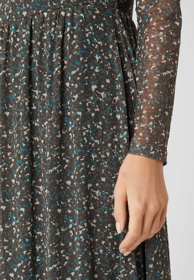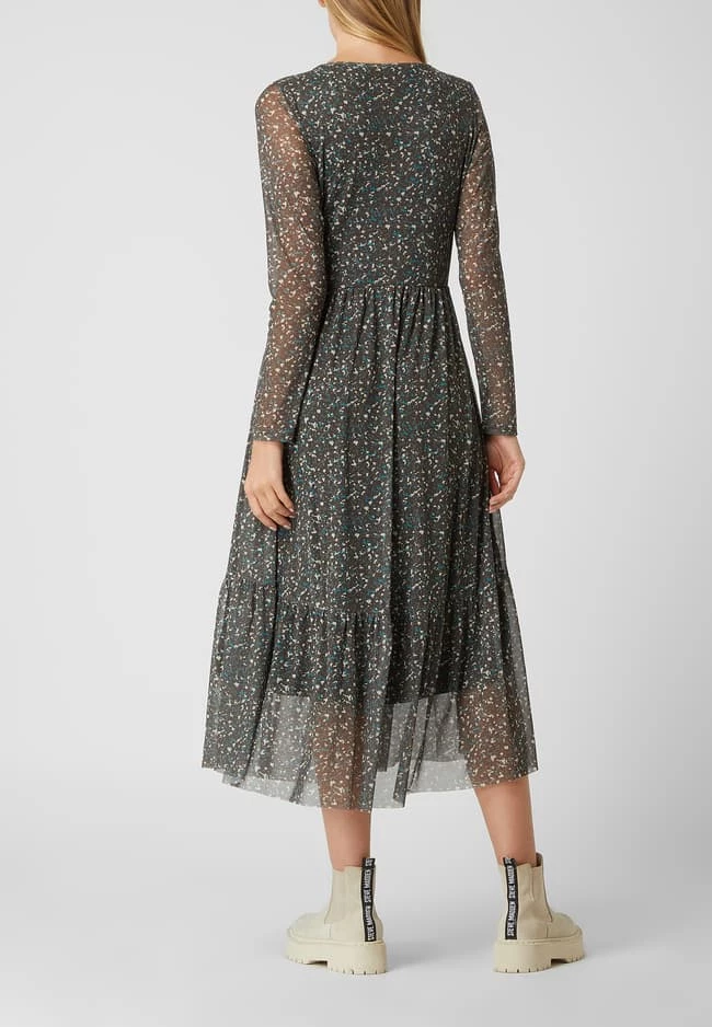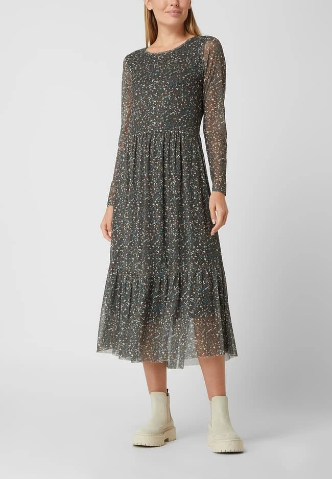 Das Midikleid von TOM TAILOR ist aus Mesh gefertigt und tailliert geschnitten. Es zeigt sich mit Allover-Muster, Rundhalsausschnitt und Volants.