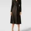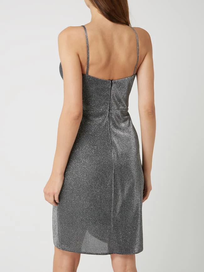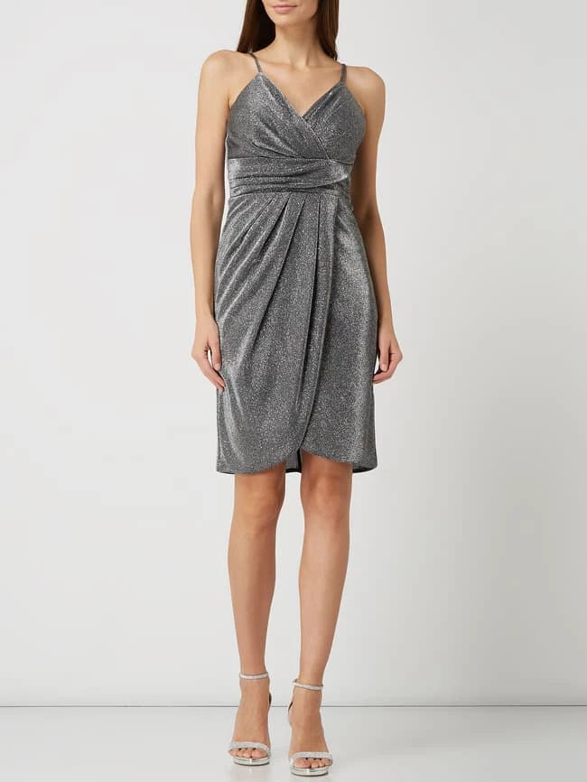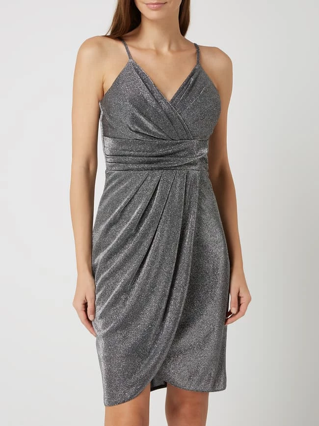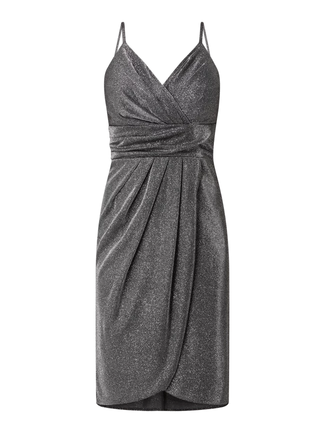 Das Cocktailkleid von TROYDEN COLLECTION ist aus leichtem Material mit Glitter-Effekt gefertigt und eng anliegend geschnitten. Es zeigt sich in Wickel-Optik mit V-Ausschnitt, schmalen Trägern und gelegten Falten.
