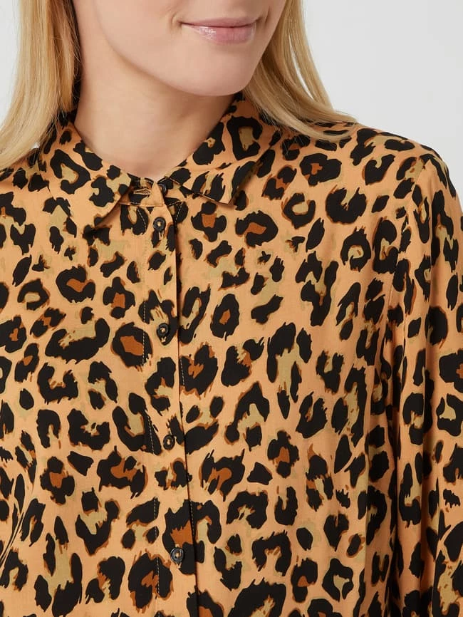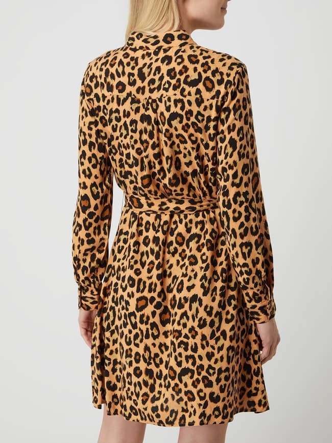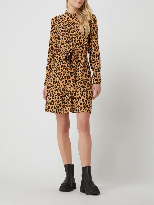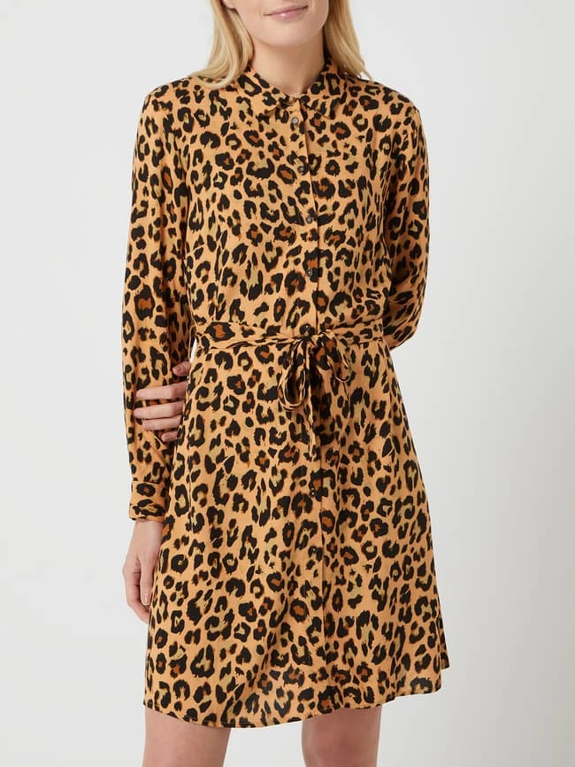 Das Blusenkleid von VILA ist aus reiner Viskose gefertigt und tailliert geschnitten. Es kommt mit Allover-Muster, Umlegekragen und fixiertem Taillengürtel zum Binden.
